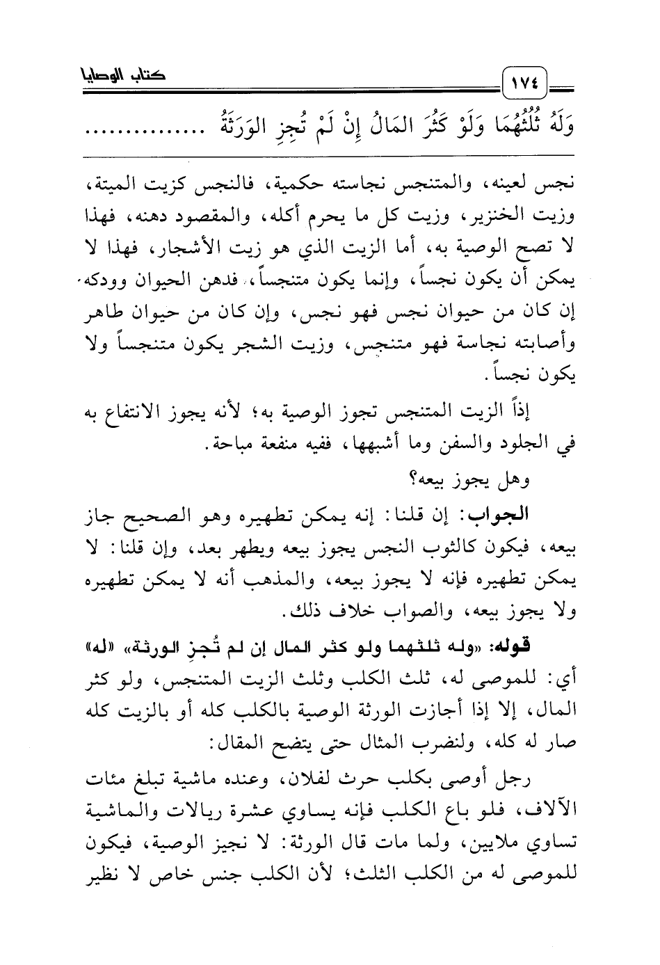 نجس لعينه، والمتنجس نجاسته حكمية، فالنجس كزيت الميتة، وزيت الخنزير، وزيت كل ما يحرم أكله، والمقصود دهنه، فهذا لا تصح الوصية به، أما الزيت الذي هو زيت الأشجار، فهذا لا يمكن أن يكون نجساً، وإنما يكون متنجساً، فدهن الحيوان وودكه إن كان من حيوان نجس فهو نجس، وإن كان من حيوان طاهر وأصابته نجاسة فهو متنجس، وزيت الشجر يكون متنجساً ولا يكون نجساً.