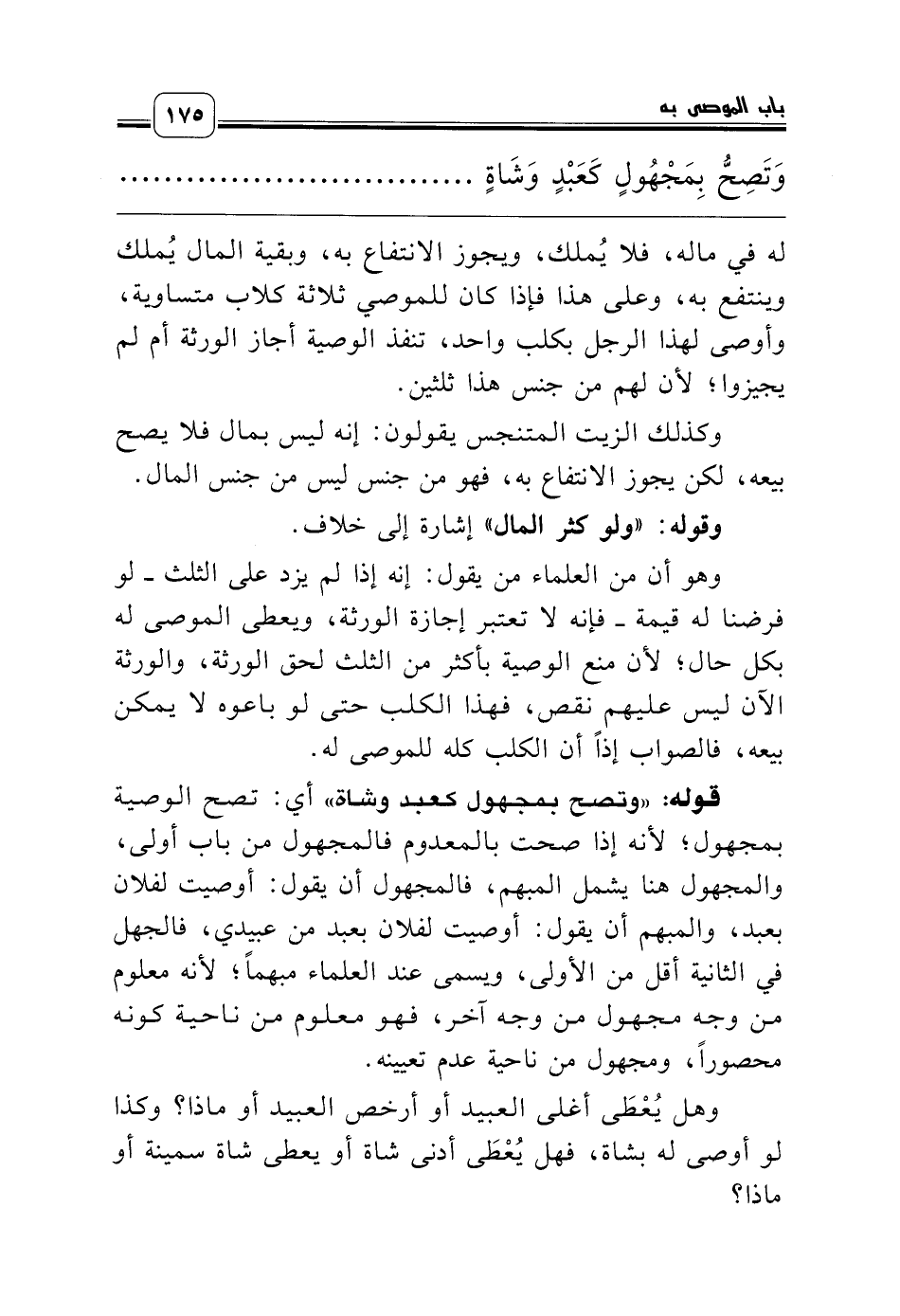 قوله: «وتصح بمجهول كعبد وشاة» أي: تصح الوصية بمجهول؛ لأنه إذا صحت بالمعدوم فالمجهول من باب أولى، والمجهول هنا يشمل المبهم، فالمجهول أن يقول: أوصيت لفلان بعبد، والمبهم أن يقول: أوصيت لفلان بعبد من عبيدي، فالجهل في الثانية أقل من الأولى، ويسمى عند العلماء مبهماً؛ لأنه معلوم من وجه مجهول من وجه آخر، فهو معلوم من ناحية كونه محصوراً، ومجهول من ناحية عدم تعيينه.