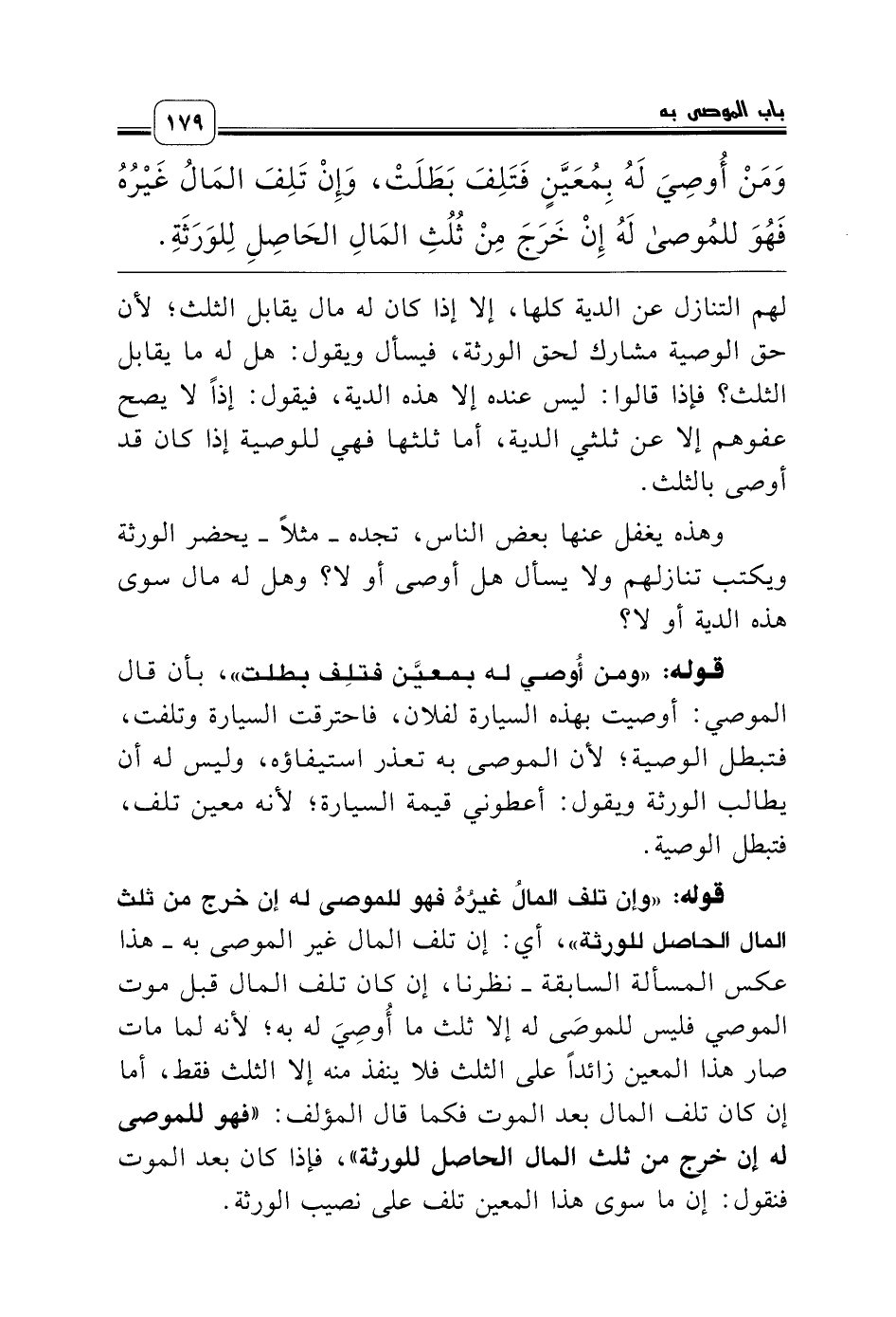 وَمَنْ أُوصِيَ لَهُ بِمُعَيَّنٍ فَتَلِفَ بَطَلَتْ، وَإِنْ تَلِفَ المَالُ غَيْرُهُ فَهُوَ للمُوصى لَهُ إِنْ خَرَجَ مِنْ ثُلُثِ المَالِ الحَاصِلِ لِلوَرَثَةِ.