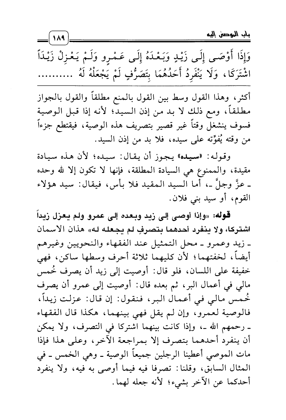 قوله: «وإذا أوصى إلى زيد وبعده إلى عمرو ولم يعزل زيداً اشتركا، ولا ينفرد أحدهما بتصرفٍ لم يجعله له» هذان الاسمان ـ زيد وعمرو ـ محل التمثيل عند الفقهاء والنحويين وغيرهم أيضاً، لخفتهما؛ لأن كليهما ثلاثة أحرف وسطها ساكن، فهي خفيفة على اللسان، فلو قال: أوصيت إلى زيد أن يصرف خُمس مالي في أعمال البر، ثم بعده قال: أوصيت إلى عمرو أن يصرف خُمس مالي في أعمال البر، فنقول: إن قال: عزلت زيداً، فالوصية لعمرو، وإن لم يقل فهي بينهما، هكذا قال الفقهاء ـ رحمهم الله ـ، وإذا كانت بينهما اشتركا في التصرف، ولا يمكن أن ينفرد أحدهما بتصرف إلا بمراجعة الآخر، وعلى هذا فإذا مات الموصي أعطينا الرجلين جميعاً الوصية ـ وهي الخمس ـ في المثال السابق، وقلنا: تصرفا فيه فيما أوصى به فيه، ولا ينفرد أحدكما عن الآخر بشيء؛ لأنه جعله لهما.