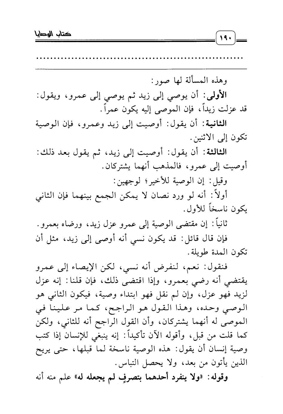 فنقول: نعم، لنفرض أنه نسي، لكن الإيصاء إلى عمرو يقتضي أنه رضي بعمرو، وإذا اقتضى ذلك، فإن قلنا: إنه عزل لزيد فهو عزل، وإن لم نقل فهو ابتداء وصية، فيكون الثاني هو الوصي وحده، وهذا القول هو الراجح، كما مر علينا في الموصى له أنهما يشتركان، وأن القول الراجح أنه للثاني، ولكن كما قلت من قبل، وأقوله الآن تأكيداً: إنه ينبغي للإنسان إذا كتب وصية إنسان أن يقول: هذه الوصية ناسخة لما قبلها، حتى يريح الذين يأتون من بعد، ولا يحصل التباس.