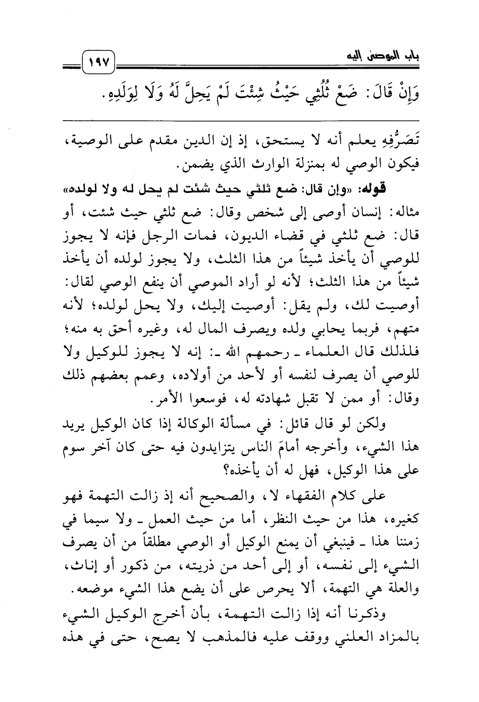 قوله: «وإن قال: ضع ثلثي حيث شئت لم يحل له ولا لولده» مثاله: إنسان أوصى إلى شخص وقال: ضع ثلثي حيث شئت، أو قال: ضع ثلثي في قضاء الديون، فمات الرجل فإنه لا يجوز للوصي أن يأخذ شيئاً من هذا الثلث، ولا يجوز لولده أن يأخذ شيئاً من هذا الثلث؛ لأنه لو أراد الموصي أن ينفع الوصي لقال: أوصيت لك، ولم يقل: أوصيت إليك، ولا يحل لولده؛ لأنه متهم، فربما يحابي ولده ويصرف المال له، وغيره أحق به منه؛ فلذلك قال العلماء ـ رحمهم الله ـ: إنه لا يجوز للوكيل ولا للوصي أن يصرف لنفسه أو لأحد من أولاده، وعمم بعضهم ذلك وقال: أو ممن لا تقبل شهادته له، فوسعوا الأمر.
