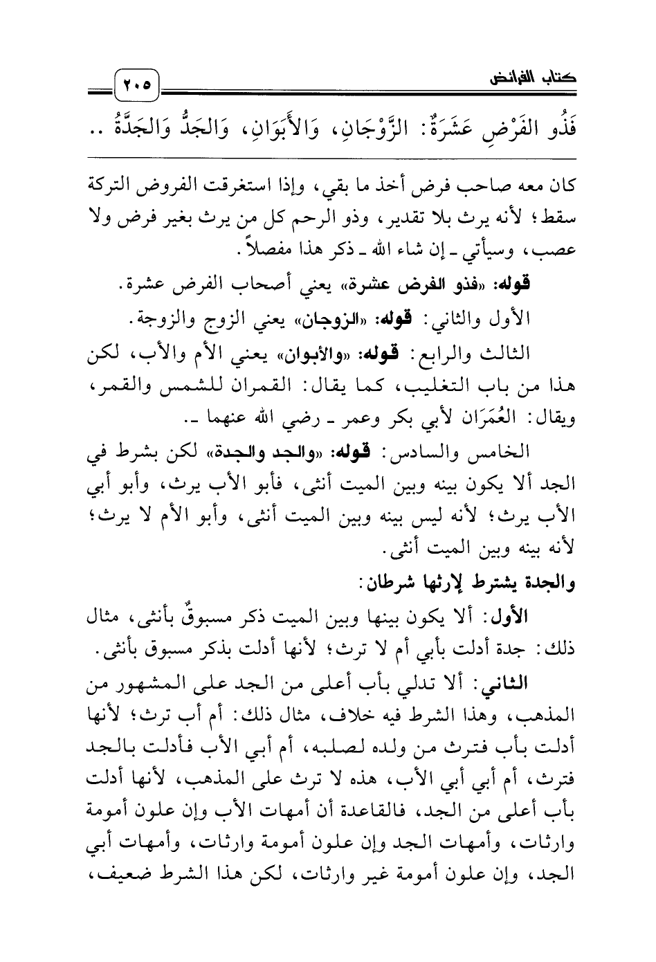 فَذُو الفَرْضِ عَشَرَةٌ: الزَّوْجَانِ، وَالأَبَوَانِ، وَالجَدُّ وَالجَدَّةُ وَالبَنَاتُ، وَبَنَاتُ الابْنِ، وَالأَخَوَاتُ مِنْ كُلِّ جِهَةٍ، وَالإخْوَةُ مِنَ الاُمِّ، ...