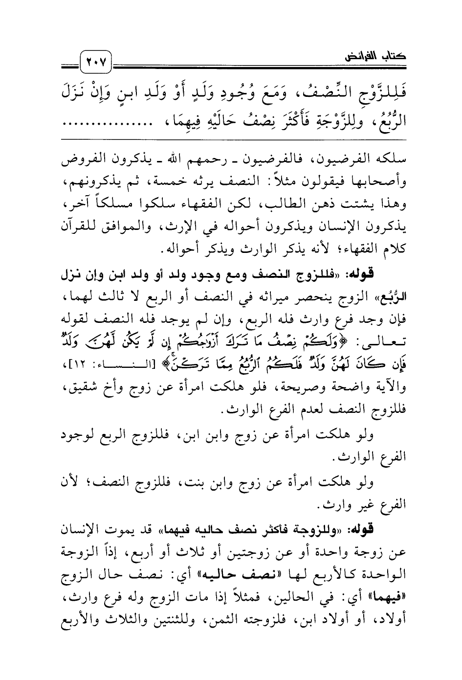قوله: «فللزوج النصف ومع وجود ولد أو ولد ابن وإن نزل الرُّبُع» الزوج ينحصر ميراثه في النصف أو الربع لا ثالث لهما، فإن وجد فرع وارث فله الربع، وإن لم يوجد فله النصف لقوله تعالى: {وَلَكُمْ نِصْفُ مَا تَرَكَ أَزْوَاجُكُمْ إِنْ لَمْ يَكُنْ لَهُنَّ وَلَدٌ فَإِنْ كَانَ لَهُنَّ وَلَدٌ فَلَكُمُ الرُّبُعُ مِمَّا تَرَكْنَ} [النساء: 12]، والآية واضحة وصريحة، فلو هلكت امرأة عن زوج وأخ شقيق، فللزوج النصف لعدم الفرع الوارث.