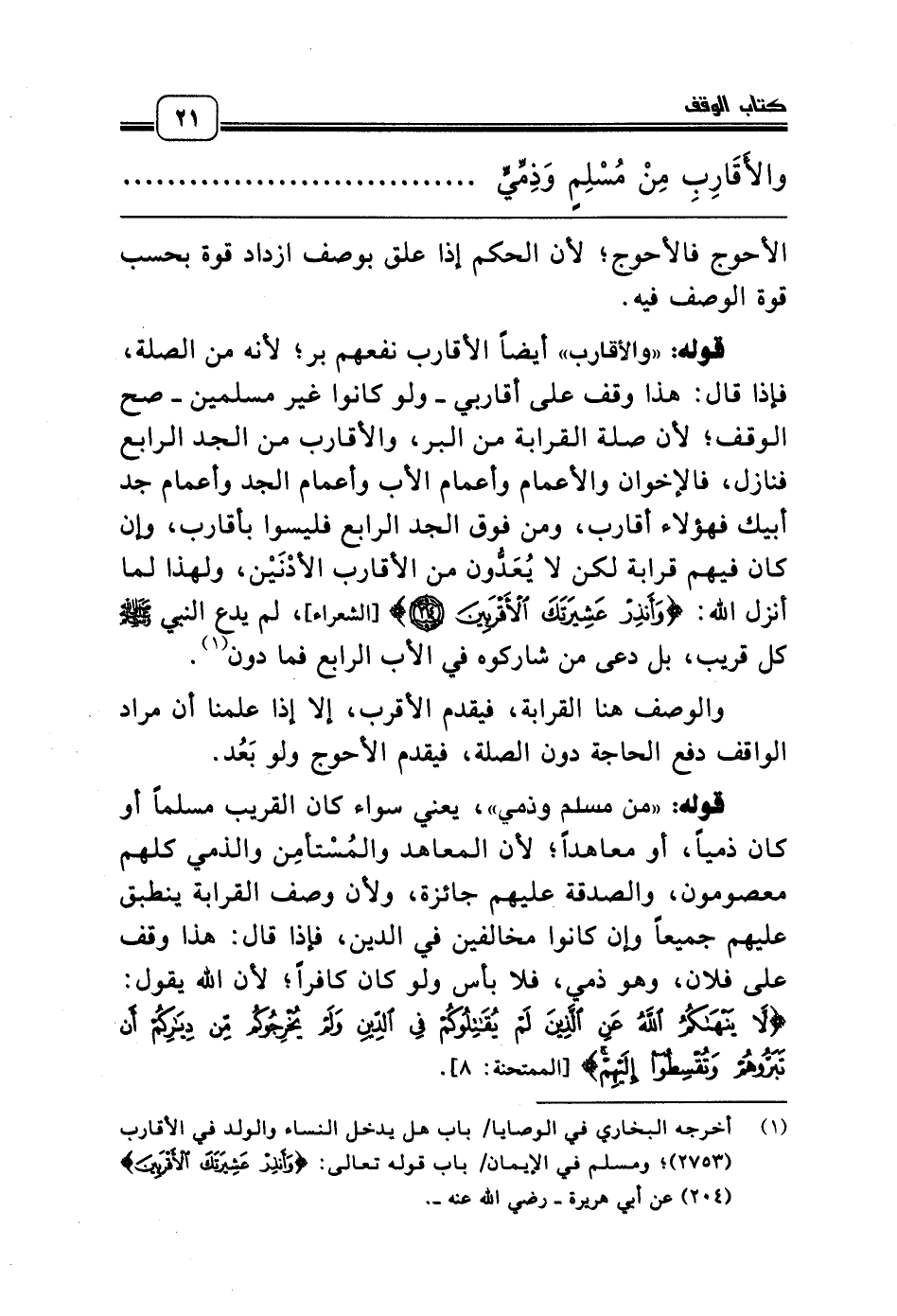 قوله: «والأقارب» أيضاً الأقارب نفعهم بر؛ لأنه من الصلة، فإذا قال: هذا وقف على أقاربي ـ ولو كانوا غير مسلمين ـ صح الوقف؛ لأن صلة القرابة من البر، والأقارب من الجد الرابع فنازل، فالإخوان والأعمام وأعمام الأب وأعمام الجد وأعمام جد أبيك فهؤلاء أقارب، ومن فوق الجد الرابع فليسوا بأقارب، وإن كان فيهم قرابة لكن لا يُعَدُّون من الأقارب الأدْنَيْن، ولهذا لما أنزل الله: {وَأَنْذِرْ عَشِيرَتَكَ الأَقْرَبِينَ *} [الشعراء]، لم يدع النبي صلّى الله عليه وسلّم كل قريب، بل دعى من شاركوه في الأب الرابع فما دون (¬1).