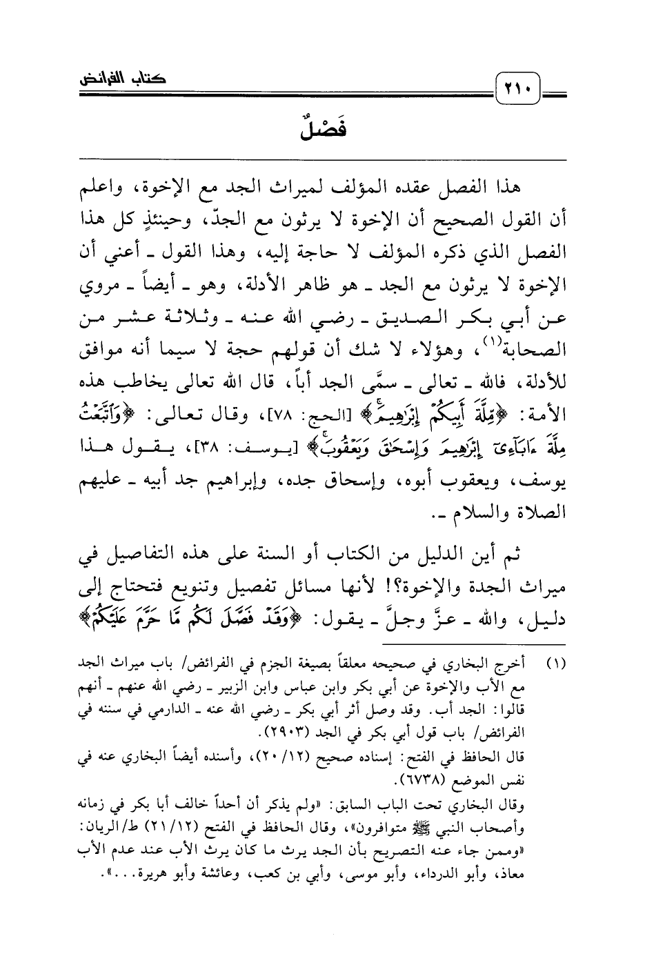 هذا الفصل عقده المؤلف لميراث الجد مع الإخوة، واعلم أن القول الصحيح أن الإخوة لا يرثون مع الجدّ، وحينئذٍ كل هذا الفصل الذي ذكره المؤلف لا حاجة إليه، وهذا القول ـ أعني أن الإخوة لا يرثون مع الجد ـ هو ظاهر الأدلة، وهو ـ أيضاً ـ مروي عن أبي بكر الصديق ـ رضي الله عنه ـ وثلاثة عشر من الصحابة (¬1)، وهؤلاء لا شك أن قولهم حجة لا سيما أنه موافق للأدلة، فالله ـ تعالى ـ سمَّى الجد أباً، قال الله تعالى يخاطب هذه الأمة: {مِلَّةَ أَبِيكُمْ إِبْرَاهِيمَ} [الحج: 78]، وقال تعالى: {وَاتَّبَعْتُ مِلَّةَ آبَائِي إِبْرَاهِيمَ وَإِسْحَاقَ وَيَعْقُوبَ} [يوسف: 38]، يقول هذا يوسف، ويعقوب أبوه، وإسحاق جده، وإبراهيم جد أبيه ـ عليهم الصلاة والسلام ـ.
