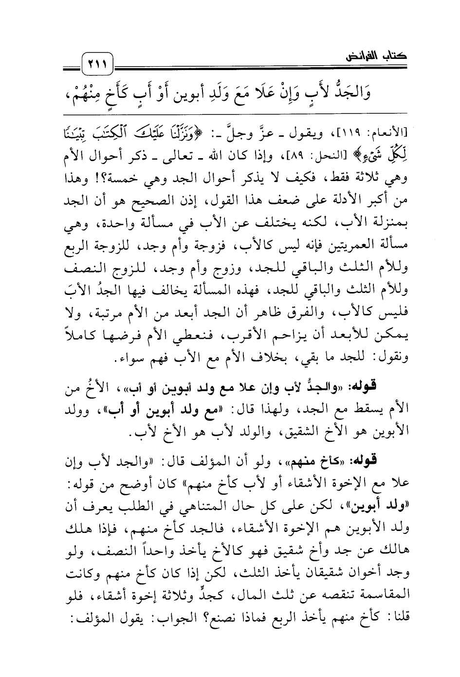[الأنعام: 119]، ويقول ـ عزّ وجل ـ: {وَنَزَّلْنَا عَلَيْكَ الْكِتَابَ تِبْيَاناً لِكُلِّ شَيْءٍ} [النحل: 89]، وإذا كان الله ـ تعالى ـ ذكر أحوال الأم وهي ثلاثة فقط، فكيف لا يذكر أحوال الجد وهي خمسة؟! وهذا من أكبر الأدلة على ضعف هذا القول، إذن الصحيح هو أن الجد بمنزلة الأب، لكنه يختلف عن الأب في مسألة واحدة، وهي مسألة العمريتين فإنه ليس كالأب، فزوجة وأم وجد، للزوجة الربع وللأم الثلث والباقي للجد، وزوج وأم وجد، للزوج النصف وللأم الثلث والباقي للجد، فهذه المسألة يخالف فيها الجدُ الأبَ فليس كالأب، والفرق ظاهر أن الجد أبعد من الأم مرتبة، ولا يمكن للأبعد أن يزاحم الأقرب، فنعطي الأم فرضها كاملاً ونقول: للجد ما بقي، بخلاف الأم مع الأب فهم سواء.