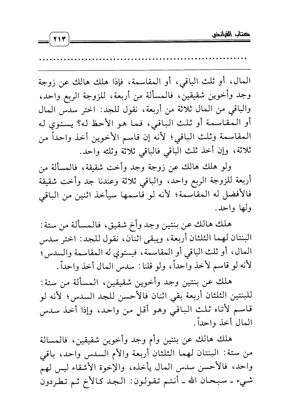 هلك هالك عن بنتين وأم وجد وأخوين شقيقين، فالمسالة من ستة: البنتان لهما الثلثان أربعة والأم السدس واحد، باقي واحد، فالأحسن سدس المال يأخذه، والإخوة الأشقاء ليس لهم شيء ـ سبحان الله ـ أنتم تقولون: الجد كالأخ ثم تطردون