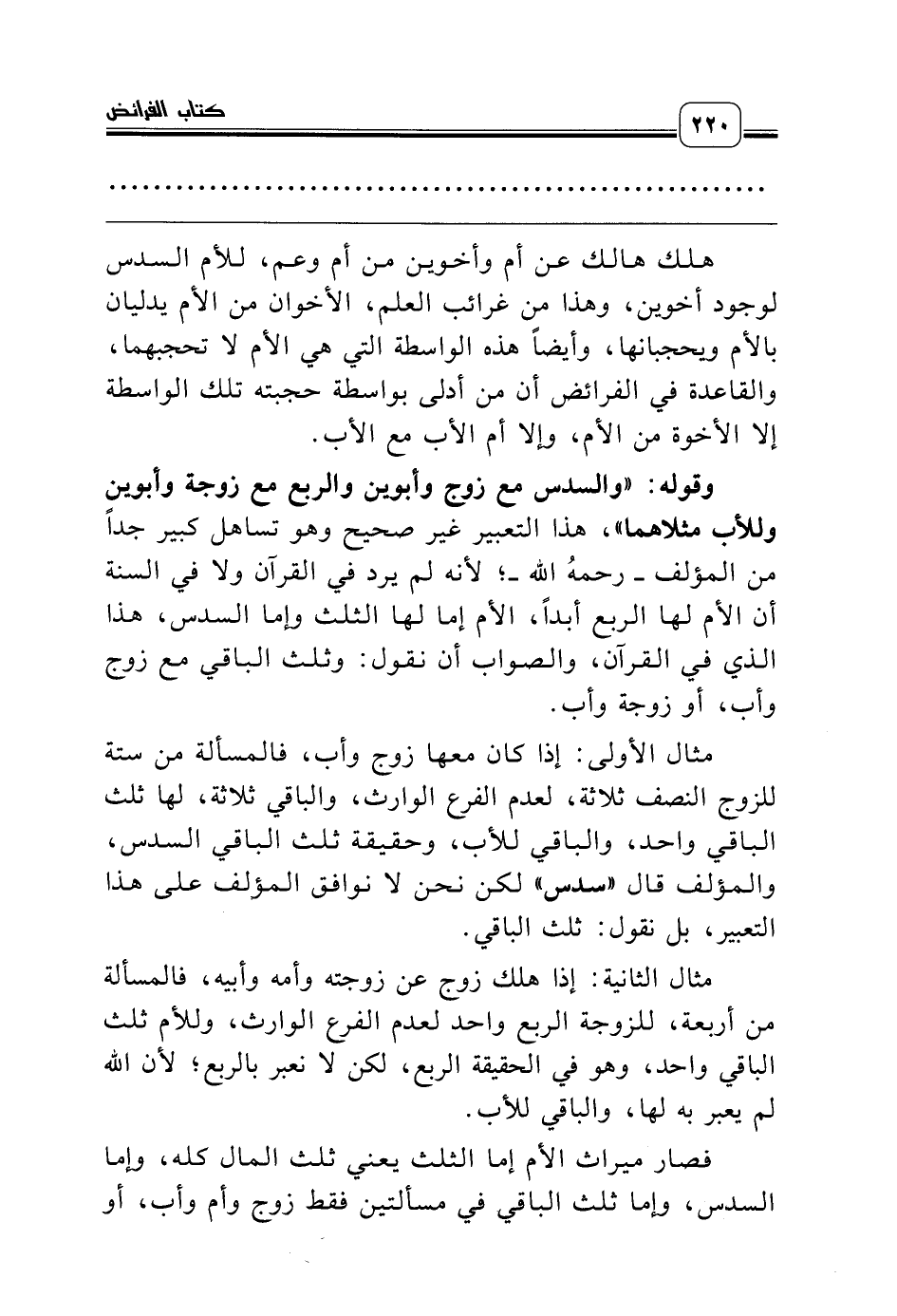 هلك هالك عن أم وأخوين من أم وعم، للأم السدس لوجود أخوين، وهذا من غرائب العلم، الأخوان من الأم يدليان بالأم ويحجبانها، وأيضاً هذه الواسطة التي هي الأم لا تحجبهما، والقاعدة في الفرائض أن من أدلى بواسطة حجبته تلك الواسطة إلا الأخوة من الأم، وإلا أم الأب مع الأب.