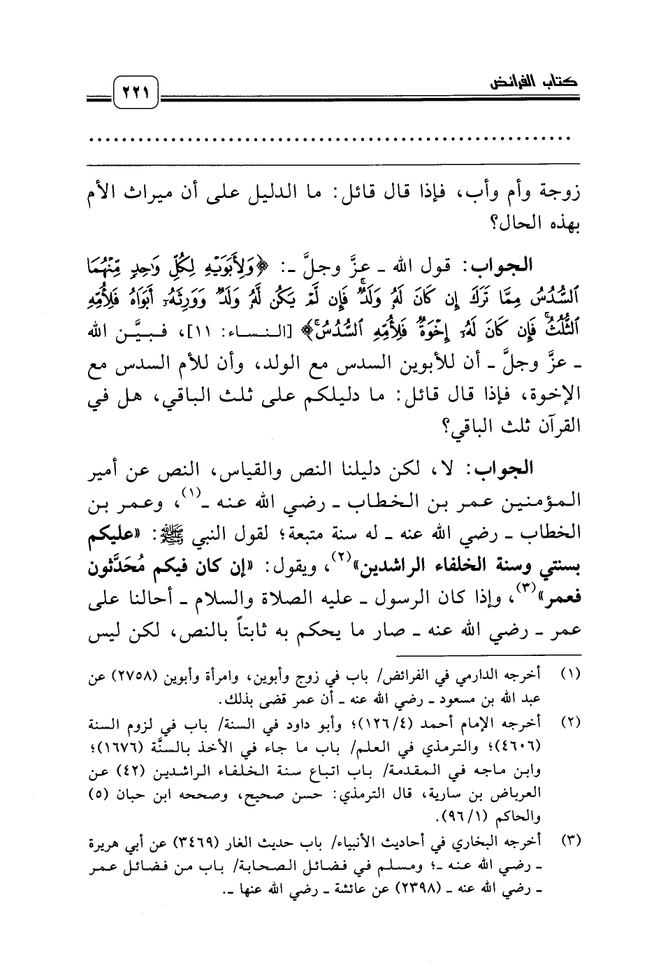 (¬1) أخرجه الدارمي في الفرائض/ باب في زوج وأبوين، وامرأة وأبوين (2758) عن عبد الله بن مسعود ـ رضي الله عنه ـ أن عمر قضى بذلك.