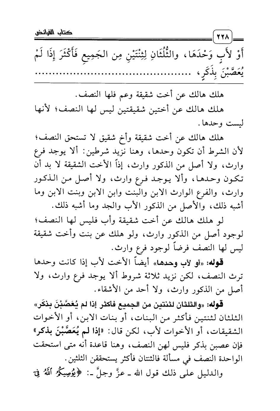 قوله: «أو لأب وحدها» أيضاً الأخت لأب إذا كانت وحدها ترث النصف، لكن نزيد ثلاثة شروط ألا يوجد فرع وارث، ولا أصل من الذكور وارث، ولا أحد من الأشقاء.