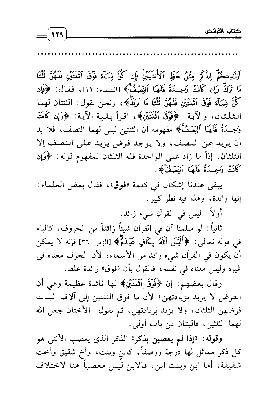 أَوْلاَدِكُمْ لِلذَّكَرِ مِثْلُ حَظِّ الأُنْثَيَيْنِ فَإِنْ كُنَّ نِسَاءً فَوْقَ اثْنَتَيْنِ فَلَهُنَّ ثُلُثَا مَا تَرَكَ وَإِنْ كَانَتْ وَاحِدَةً فَلَهَا النِّصْفُ} [النساء: 11]، فقال: {فَإِنْ كُنَّ نِسَاءً فَوْقَ اثْنَتَيْنِ فَلَهُنَّ ثُلُثَا مَا تَرَكَ}، ونحن نقول: الثنتان لهما الثلثان، والآية: {فَوْقَ اثْنَتَيْنِ}، اقرأ بقية الآية: {وَإِنْ كَانَتْ وَاحِدَةً فَلَهَا النِّصْفُ} مفهومه أن الثنتين ليس لهما النصف، فلا بد أن يزيد عن النصف، ولا يوجد فرض يزيد على النصف إلا الثلثان، إذاً ما زاد على الواحدة فله الثلثان لمفهوم قوله: {وَإِنْ كَانَتْ وَاحِدَةً فَلَهَا النِّصْفُ}.