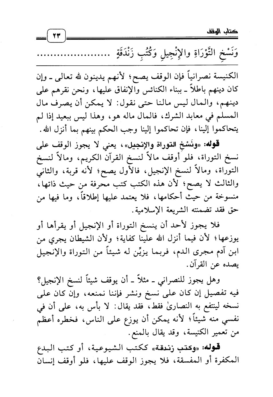 وهل يجوز للنصراني ـ مثلاً ـ أن يوقف شيئاً لنسخ الإنجيل؟ فيه تفصيل إن كان على نسخ ونشر فإننا نمنعه، وإن كان على نسخه لينتفع به النصارى فقط، فقد يقال: لا بأس به، على أن في نفسي منه شيئاً؛ لأنه يمكن أن يوزع على الناس، فخطره أعظم من تعمير الكنيسة، وقد يقال بالمنع.