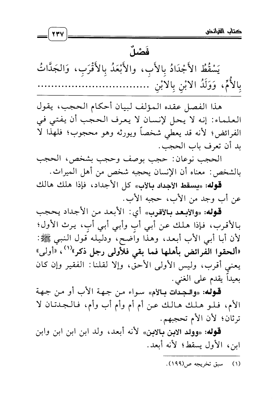 هذا الفصل عقده المؤلف لبيان أحكام الحجب، يقول العلماء: إنه لا يحل لإنسان لا يعرف الحجب أن يفتي في الفرائض؛ لأنه قد يعطي شخصاً ويورثه وهو محجوب؛ فلهذا لا بد أن تعرف باب الحجب.