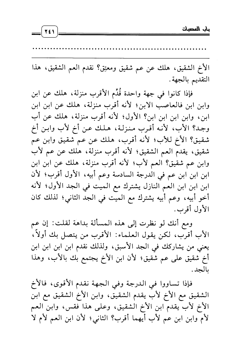 فإذا كانوا في جهة واحدة قُدِّم الأقرب منزلة، هلك عن ابن وابن ابن فالعاصب الابن؛ لأنه أقرب منزلة، هلك عن ابن ابن ابن، وابن ابن ابن ابن؟ الأول؛ لأنه أقرب منزلة، هلك عن أب وجد؟ الأب، لأنه أقرب منزلة، هلك عن أخ لأب وابن أخ شقيق؟ الأخ للأب؛ لأنه أقرب، هلك عن عم شقيق وابن عم شقيق، يقدم العم الشقيق؛ لأنه أقرب منزلة، هلك عن عم لأب وابن عم شقيق؟ العم لأب؛ لأنه أقرب منزلة، هلك عن ابن ابن ابن ابن ابن عم في الدرجة السادسة وعم أبيه، الأول أقرب؛ لأن ابن ابن ابن العم النازل يشترك مع الميت في الجد الأول؛ لأنه أخو أبيه، وعم أبيه يشترك مع الميت في الجد الثاني؛ لذلك كان الأول أقرب.