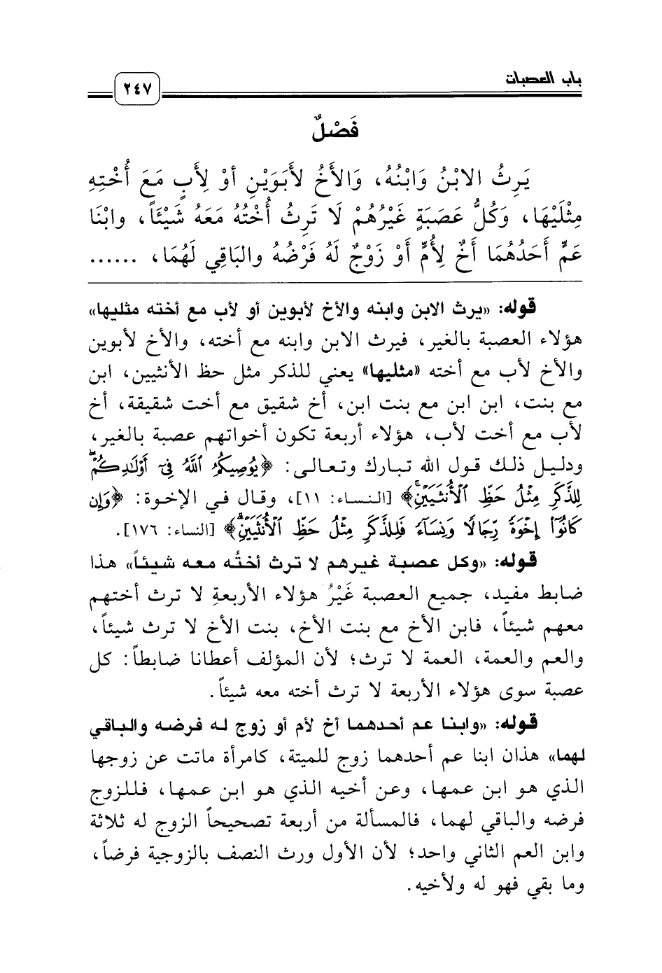 يَرِثُ الابْنُ وَابْنُهُ، وَالأَخُ لأَبَوَيْنِ أوْ لأَِبٍ مَعَ أُخْتِهِ مِثْلَيْهَا، وَكُلُّ عَصَبَةٍ غَيْرُهُمْ لاَ تَرِثُ أُخْتُهُ مَعَهُ شَيْئَاً، وابْنَا عَمٍّ أَحَدُهُمَا أَخٌ لأُِمٍّ أَوْ زَوْجٌ لَهُ فَرْضُهُ والبَاقِي لَهُمَا، ......