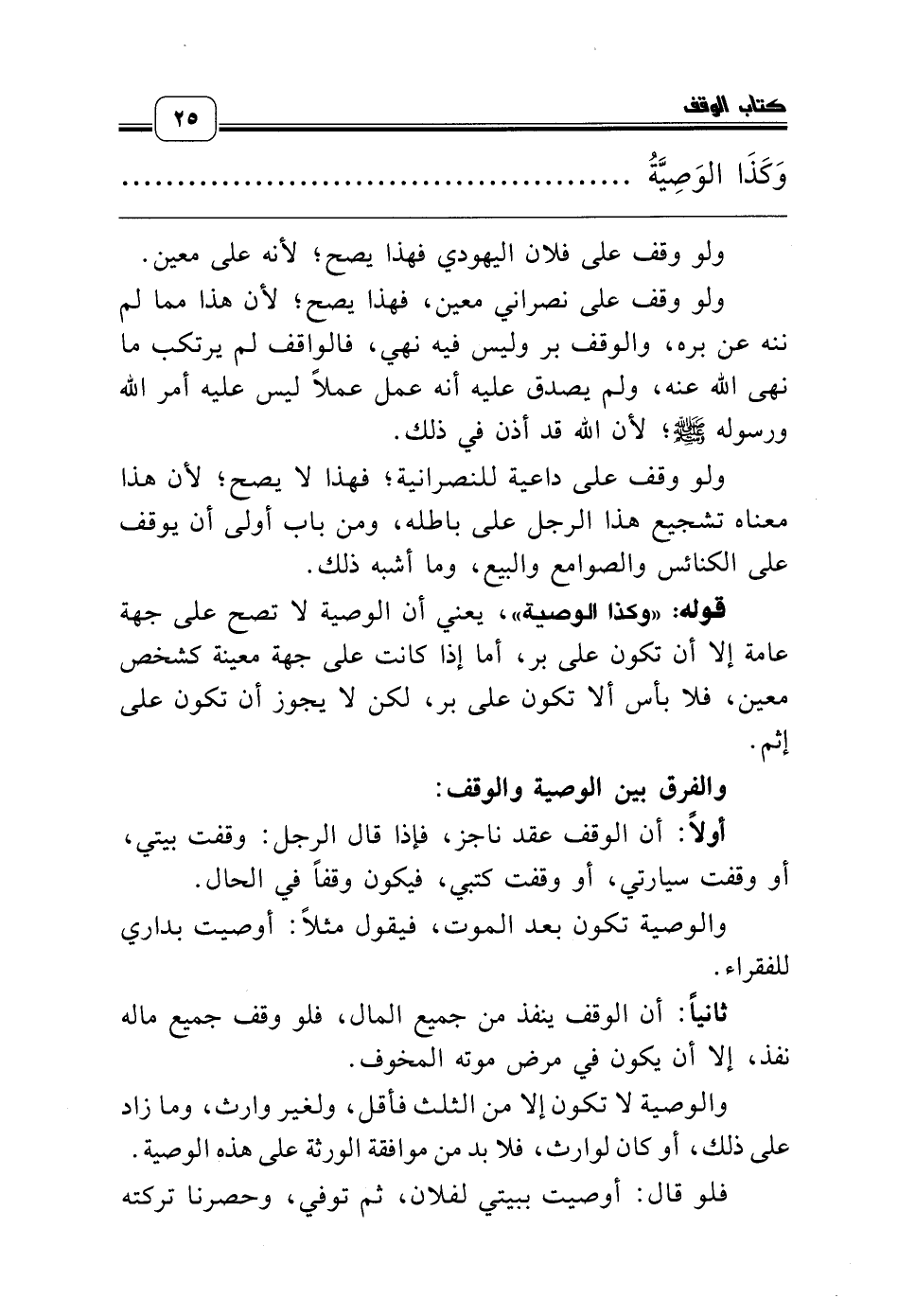قوله: «وكذا الوصية»، يعني أن الوصية لا تصح على جهة عامة إلا أن تكون على بر، أما إذا كانت على جهة معينة كشخص معين، فلا بأس ألا تكون على بر، لكن لا يجوز أن تكون على إثم.