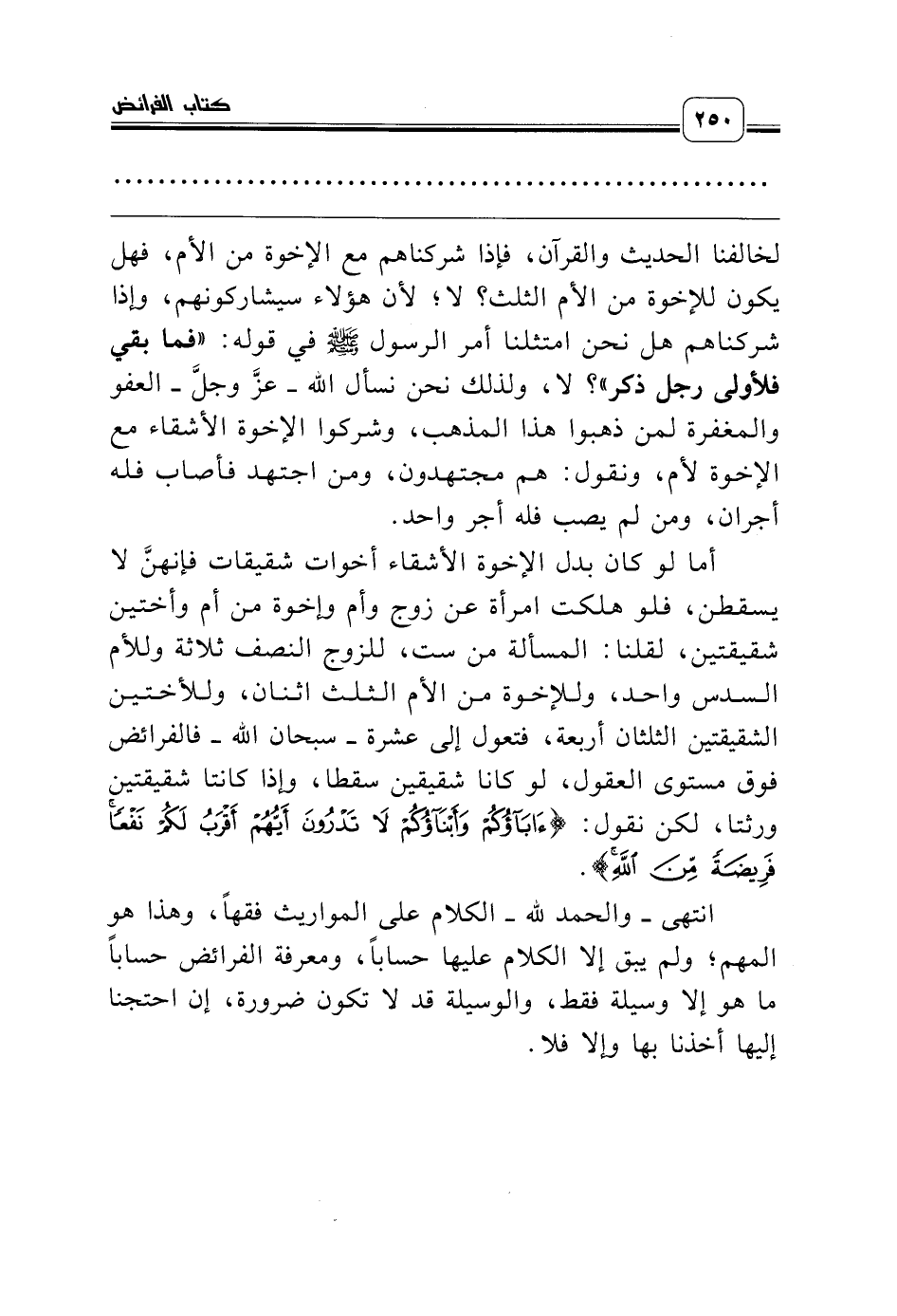 انتهى ـ والحمد لله ـ الكلام على المواريث فقهاً، وهذا هو المهم؛ ولم يبق إلا الكلام عليها حساباً، ومعرفة الفرائض حساباً ما هو إلا وسيلة فقط، والوسيلة قد لا تكون ضرورة، إن احتجنا إليها أخذنا بها وإلا فلا.
