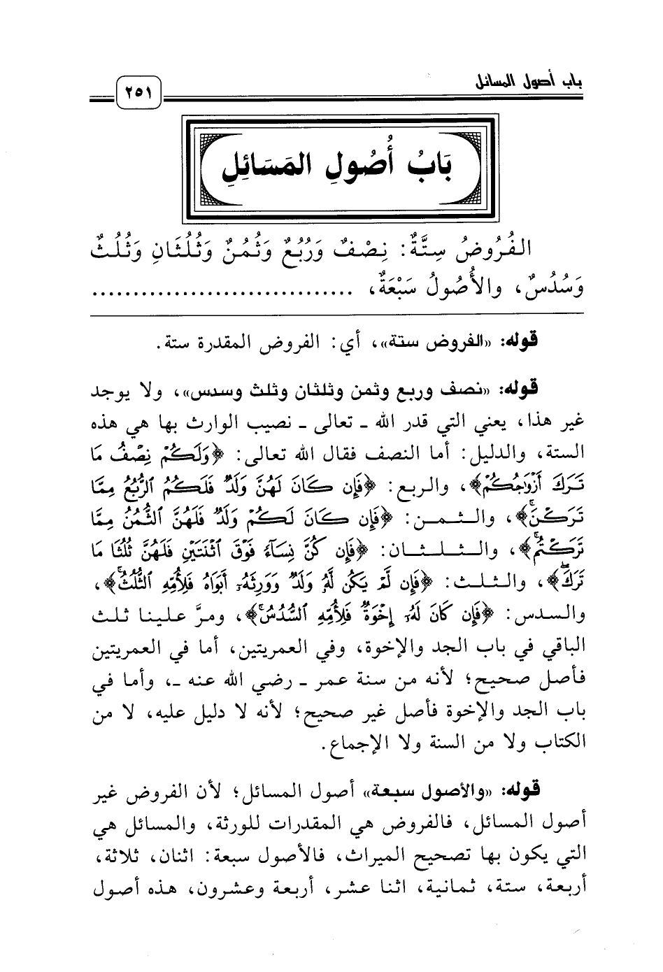 الفُرُوضُ سِتَّةٌ: نِصْفٌ وَرُبُعٌ وَثُمُنٌ وَثُلُثَانِ وَثُلُثٌ وَسُدُسٌ، والأُصُولُ سَبْعَةٌ، .......