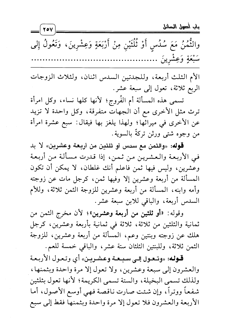 قوله: «وتعول إلى سبعة وعشرين» أي وتعول الأربعة والعشرون إلى سبعة وعشرين، ولا تعول إلا مرة واحدة وبثمنها، ولذلك تسمى البخيلة، والستة تسمى الكريمة؛ لأنها تعول بثلثين شفعاً ووتراً، وإن شئت صارت ناقصة فهي أوسع الأصول، أما الأربعة والعشرون فلا تعول إلا مرة واحدة وبثمنها فقط إلى سبع