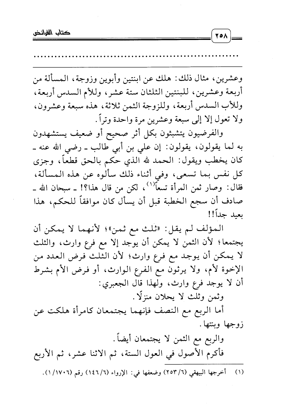 والفرضيون يتشبثون بكل أثر صحيح أو ضعيف يستشهدون به لما يقولون، يقولون: إن علي بن أبي طالب ـ رضي الله عنه ـ كان يخطب ويقول: الحمد لله الذي حكم بالحق قطعاً، وجزى كل نفس بما تسعى، وفي أثناء ذلك سألوه عن هذه المسألة، فقال: وصار ثمن المرأة تسعاً (¬1)، لكن من قال هذا؟! ـ سبحان الله ـ صادف أن سجع الخطبة قبل أن يسأل كان موافقاً للحكم، هذا بعيد جداً!!