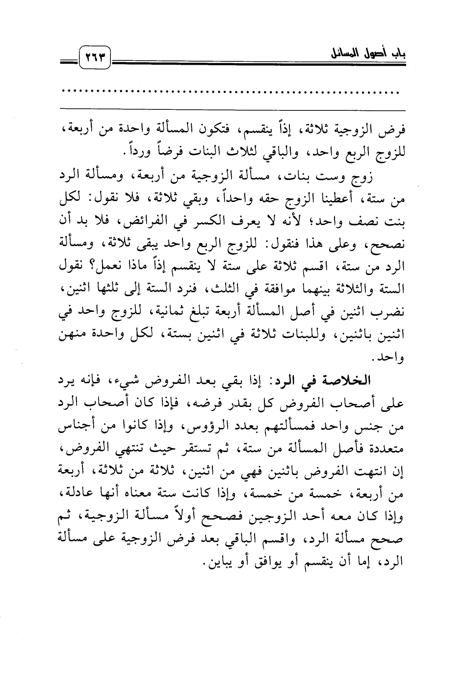 الخلاصة في الرد: إذا بقي بعد الفروض شيء، فإنه يرد على أصحاب الفروض كل بقدر فرضه، فإذا كان أصحاب الرد من جنس واحد فمسألتهم بعدد الرؤوس، وإذا كانوا من أجناس متعددة فأصل المسألة من ستة، ثم تستقر حيث تنتهي الفروض، إن انتهت الفروض باثنين فهي من اثنين، ثلاثة من ثلاثة، أربعة من أربعة، خمسة من خمسة، وإذا كانت ستة معناه أنها عادلة، وإذا كان معه أحد الزوجين فصحح أولاً مسألة الزوجية، ثم صحح مسألة الرد، واقسم الباقي بعد فرض الزوجية على مسألة الرد، إما أن ينقسم أو يوافق أو يباين.