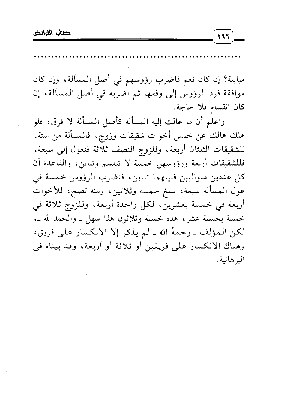 واعلم أن ما عالت إليه المسألة كأصل المسألة لا فرق، فلو هلك هالك عن خمس أخوات شقيقات وزوج، فالمسألة من ستة، للشقيقات الثلثان أربعة، وللزوج النصف ثلاثة فتعول إلى سبعة، فللشقيقات أربعة ورؤوسهن خمسة لا تنقسم وتباين، والقاعدة أن كل عددين متواليين فبينهما تباين، فنضرب الرؤوس خمسة في عول المسألة سبعة، تبلغ خمسة وثلاثين، ومنه تصح، للأخوات أربعة في خمسة بعشرين، لكل واحدة أربعة، وللزوج ثلاثة في خمسة بخمسة عشر، هذه خمسة وثلاثون هذا سهل ـ والحمد لله ـ، لكن المؤلف ـ رحمه الله ـ لم يذكر إلا الانكسار على فريق، وهناك الانكسار على فريقين أو ثلاثة أو أربعة، وقد بيناه في البرهانية.