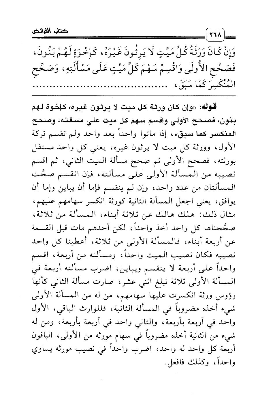 قوله: «وإن كان ورثة كل ميت لا يرثون غيره، كإخوة لهم بنون، فصحح الأولى واقسم سهم كل ميت على مسألته، وصحح المنكسر كما سبق»، إذا ماتوا واحداً بعد واحد ولم تقسم تركة الأول، وورثة كل ميت لا يرثون غيره، يعني كل واحد مستقل بورثته، فصحح الأولى ثم صحح مسألة الميت الثاني، ثم اقسم نصيبه من المسألة الأولى على مسألته، فإن انقسم صحَّت المسألتان من عدد واحد، وإن لم ينقسم فإما أن يباين وإما أن يوافق، يعني اجعل المسألة الثانية كورثة انكسر سهامهم عليهم، مثال ذلك: هلك هالك عن ثلاثة أبناء، المسألة من ثلاثة، صحَّحناها كل واحد أخذ واحداً، لكن أحدهم مات قبل القسمة عن أربعة أبناء، فالمسألة الأولى من ثلاثة، أعطينا كل واحد نصيبه فكان نصيب الميت واحداً، ومسألته من أربعة، اقسم واحداً على أربعة لا ينقسم ويباين، اضرب مسألته أربعة في المسألة الأولى ثلاثة تبلغ اثني عشر، صارت مسألة الثاني كأنها رؤوس ورثة انكسرت عليها سهامهم، من له من المسألة الأولى شيء أخذه مضروباً في المسألة الثانية، فللوارث الباقي، الأول واحد في أربعة بأربعة، والثاني واحد في أربعة بأربعة، ومن له شيء من الثانية أخذه مضروباً في سهام مورثه من الأولى، الباقون أربعة كل واحد له واحد، اضرب واحداً في نصيب مورثه يساوي واحداً، وكذلك فافعل.