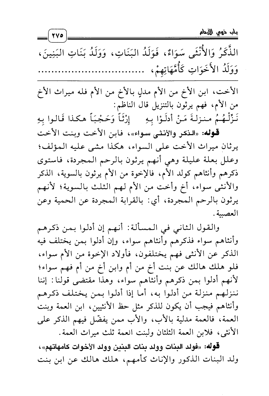 قوله: «الذكر والأنثى سواء»، فابن الأخت وبنت الأخت يرثان ميراث الأخت على السواء، هكذا مشى عليه المؤلف؛ وعلل بعلة عليلة وهي أنهم يرثون بالرحم المجردة، فاستوى ذكرهم وأنثاهم كولد الأم، فالإخوة من الأم يرثون بالسوية، الذكر والأنثى سواء، أخ وأخت من الأم لهم الثلث بالسوية؛ لأنهم يرثون بالرحم المجردة، أي: بالقرابة المجردة عن الحمية وعن العصبية.