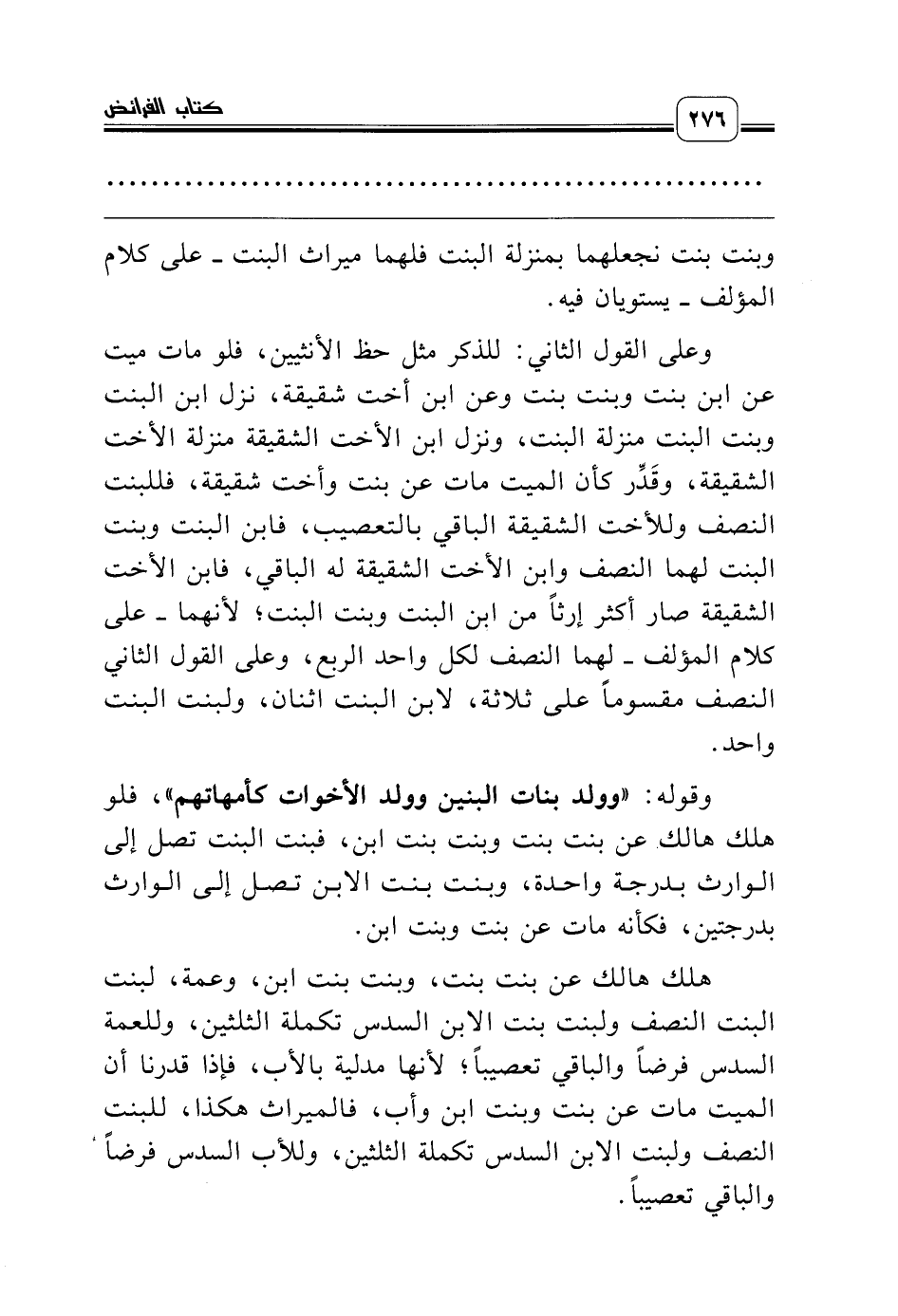 وعلى القول الثاني: للذكر مثل حظ الأنثيين، فلو مات ميت عن ابن بنت وبنت بنت وعن ابن أخت شقيقة، نزل ابن البنت وبنت البنت منزلة البنت، ونزل ابن الأخت الشقيقة منزلة الأخت الشقيقة، وقَدِّر كأن الميت مات عن بنت وأخت شقيقة، فللبنت النصف وللأخت الشقيقة الباقي بالتعصيب، فابن البنت وبنت البنت لهما النصف وابن الأخت الشقيقة له الباقي، فابن الأخت الشقيقة صار أكثر إرثاً من ابن البنت وبنت البنت؛ لأنهما ـ على كلام المؤلف ـ لهما النصف لكل واحد الربع، وعلى القول الثاني النصف مقسوماً على ثلاثة، لابن البنت اثنان، ولبنت البنت واحد.