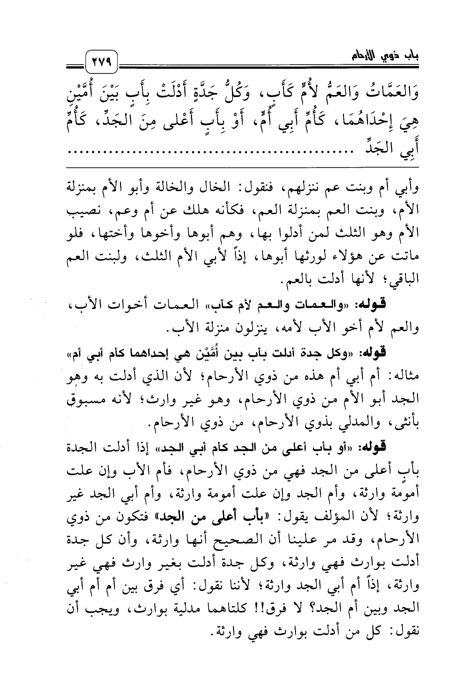 قوله: «أو بأب أعلى من الجد كأم أبي الجد» إذا أدلت الجدة بأبٍ أعلى من الجد فهي من ذوي الأرحام، فأم الأب وإن علت أمومة وارثة، وأم الجد وإن علت أمومة وارثة، وأم أبي الجد غير وارثة؛ لأن المؤلف يقول: «بأب أعلى من الجد» فتكون من ذوي الأرحام، وقد مر علينا أن الصحيح أنها وارثة، وأن كل جدة أدلت بوارث فهي وارثة، وكل جدة أدلت بغير وارث فهي غير وارثة، إذاً أم أبي الجد وارثة؛ لأننا نقول: أي فرق بين أم أم أبي الجد وبين أم الجد؟ لا فرق!! كلتاهما مدلية بوارث، ويجب أن نقول: كل من أدلت بوارث فهي وارثة.