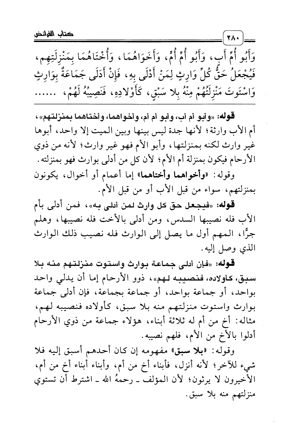 قوله: «فإن أدلى جماعة بوارث واستوت منزلتهم منه بلا سبق، كأولاده، فنصيبه لهم»، ذوو الأرحام إما أن يدلي واحد بواحد، أو جماعة بواحد، أو جماعة بجماعة، فإن أدلى جماعة بوارث واستوت منزلتهم منه بلا سبق، كأولاده فنصيبه لهم، مثاله: أخ من أم له ثلاثة أبناء، هؤلاء جماعة من ذوي الأرحام أدلوا بالأخ من الأم، فلهم نصيبه.