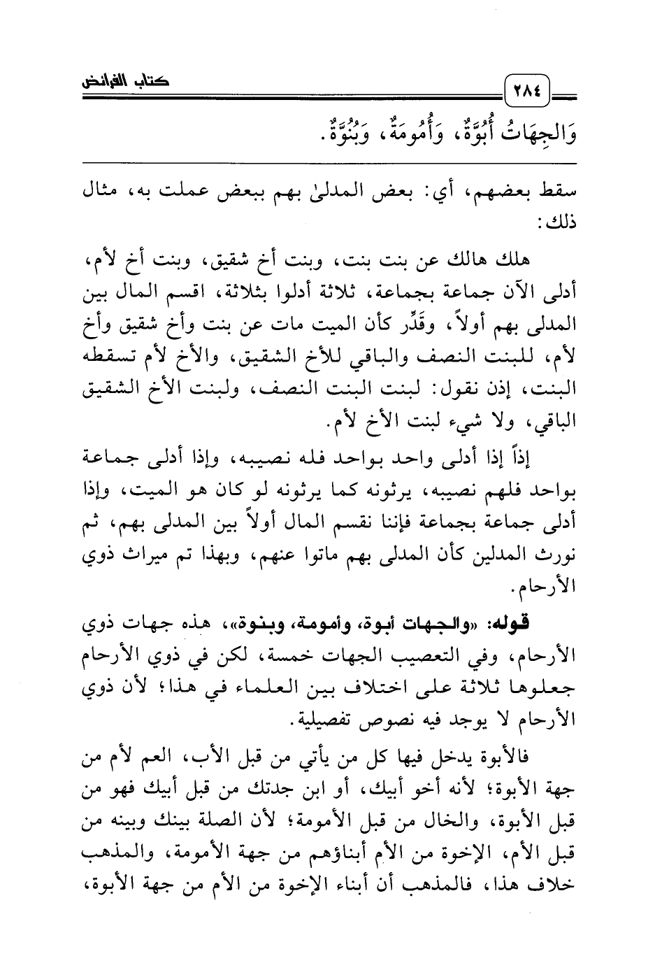 قوله: «والجهات أبوة، وأمومة، وبنوة»، هذه جهات ذوي الأرحام، وفي التعصيب الجهات خمسة، لكن في ذوي الأرحام جعلوها ثلاثة على اختلاف بين العلماء في هذا؛ لأن ذوي الأرحام لا يوجد فيه نصوص تفصيلية.