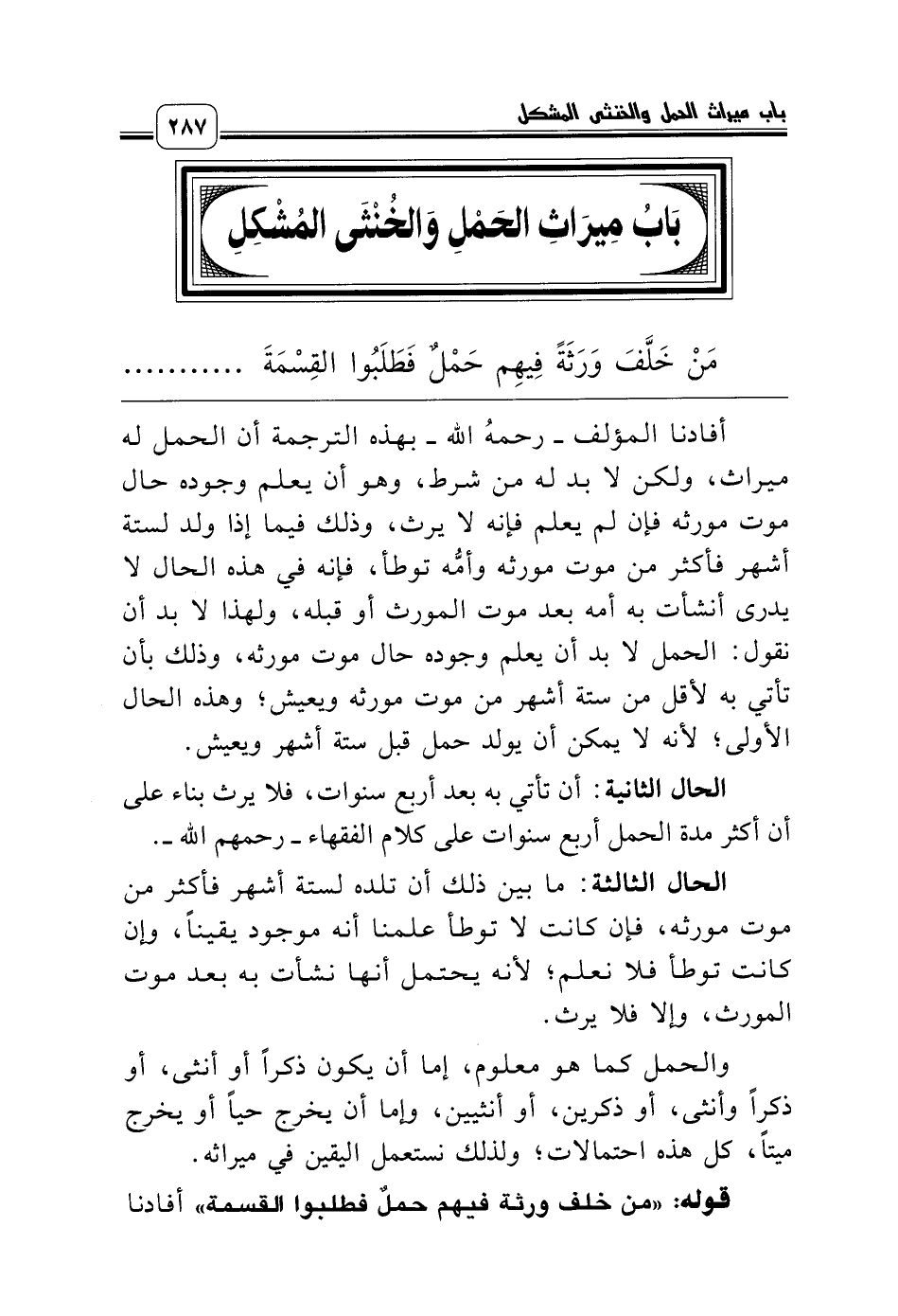 مَنْ خَلَّفَ وَرَثَةً فِيهِم حَمْلٌ فَطَلَبُوا القِسْمَةَ وُقِفَ لِلحَمْلِ الأَكْثَرُ مِنْ إِرْثِ ذَكَرَيْنِ أَوْ أُنْثَيَيْنِ، ............