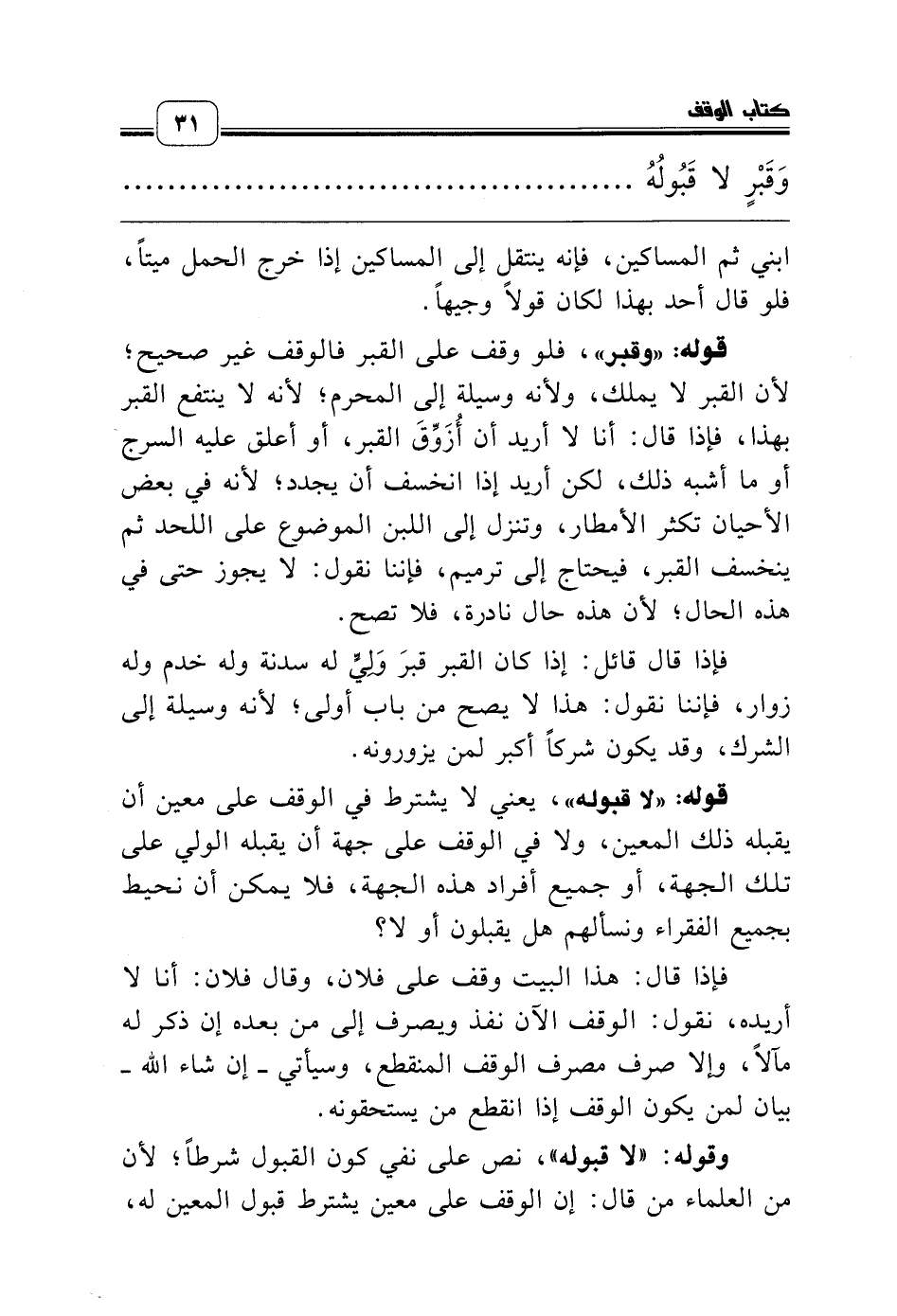 قوله: «وقبر»، فلو وقف على القبر فالوقف غير صحيح؛ لأن القبر لا يملك، ولأنه وسيلة إلى المحرم؛ لأنه لا ينتفع القبر بهذا، فإذا قال: أنا لا أريد أن أُزَوِّقَ القبر، أو أعلق عليه السرج أو ما أشبه ذلك، لكن أريد إذا انخسف أن يجدد؛ لأنه في بعض الأحيان تكثر الأمطار، وتنزل إلى اللبن الموضوع على اللحد ثم ينخسف القبر، فيحتاج إلى ترميم، فإننا نقول: لا يجوز حتى في هذه الحال؛ لأن هذه حال نادرة، فلا تصح.