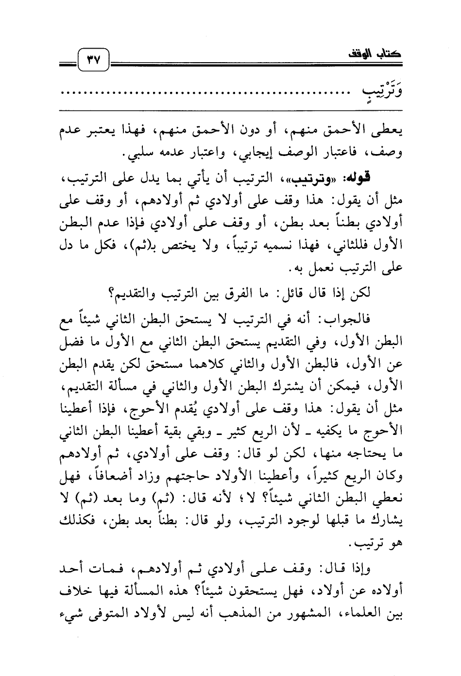 قوله: «وترتيب»، الترتيب أن يأتي بما يدل على الترتيب، مثل أن يقول: هذا وقف على أولادي ثم أولادهم، أو وقف على أولادي بطناً بعد بطن، أو وقف على أولادي فإذا عدم البطن الأول فللثاني، فهذا نسميه ترتيباً، ولا يختص بـ (ثم)، فكل ما دل على الترتيب نعمل به.