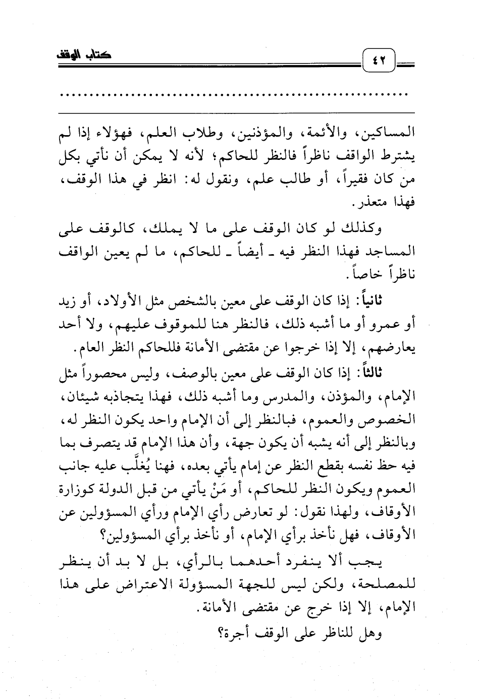 ثالثاً: إذا كان الوقف على معين بالوصف، وليس محصوراً مثل الإمام، والمؤذن، والمدرس وما أشبه ذلك، فهذا يتجاذبه شيئان، الخصوص والعموم، فبالنظر إلى أن الإمام واحد يكون النظر له، وبالنظر إلى أنه يشبه أن يكون جهة، وأن هذا الإمام قد يتصرف بما فيه حظ نفسه بقطع النظر عن إمام يأتي بعده، فهنا يُغلَّب عليه جانب العموم ويكون النظر للحاكم، أو مَنْ يأتي من قبل الدولة كوزارة الأوقاف، ولهذا نقول: لو تعارض رأي الإمام ورأي المسؤولين عن الأوقاف، فهل نأخذ برأي الإمام، أو نأخذ برأي المسؤولين؟