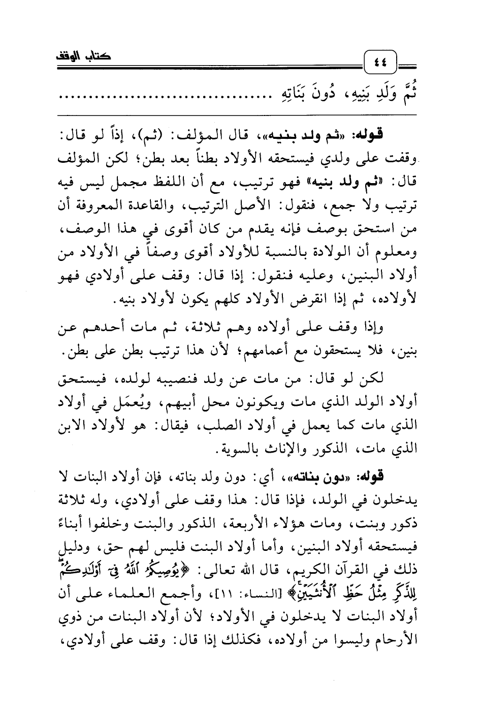 ثُمَّ وَلَدِ بَنِيهِ، دُونَ بَنَاتِهِ كَمَا لَوْ قَالَ عَلَى وَلَدِ وَلَدِهِ، وَذُرِّيَّتِهِ لِصُلْبِهِ وَلَوْ قَالَ: عَلَى بَنِيهِ أَوْ بَنِي فُلانٍ اخْتَصَّ بِذُكُورِهِمْ، ...........