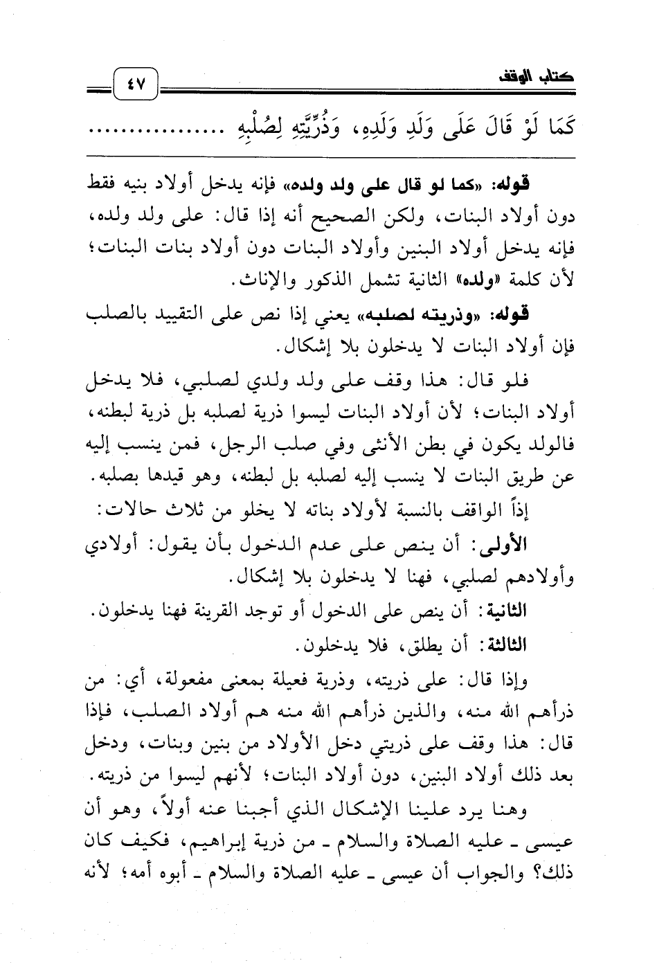 فلو قال: هذا وقف على ولد ولدي لصلبي، فلا يدخل أولاد البنات؛ لأن أولاد البنات ليسوا ذرية لصلبه بل ذرية لبطنه، فالولد يكون في بطن الأنثى وفي صلب الرجل، فمن ينسب إليه عن طريق البنات لا ينسب إليه لصلبه بل لبطنه، وهو قيدها بصلبه.
