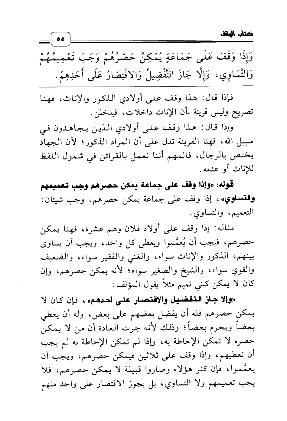 مثاله: إذا وقف على أولاد فلان وهم عشرة، فهنا يمكن حصرهم، فيجب أن يُعمَّموا ويعطى كل واحد، ويجب أن يساوى بينهم، الذكور والإناث سواء، والغني والفقير سواء، والضعيف والقوي سواء، والشيخ والصغير سواء؛ لأنه يمكن حصرهم، وإن كان لا يمكن كبني تميم مثلاً يقول المؤلف: