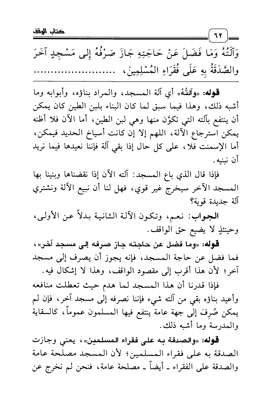 فإذا قدرنا أن هذا المسجد لما هدم حيث تعطلت منافعه وأعيد بناؤه بقي من آلته شيء فإننا نصرفه إلى مسجد آخر، فإن لم يمكن صُرِفَ إلى جهة عامة ينتفع فيها المسلمون عموماً، كالسقاية والمدرسة وما أشبه ذلك.