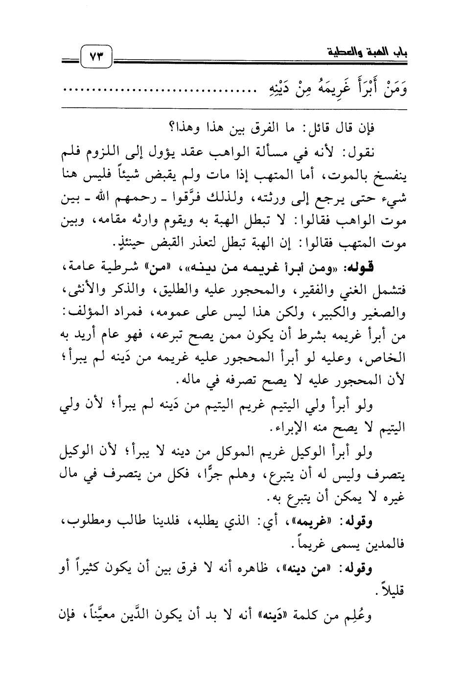 قوله: «ومن أبرأ غريمه من دينه»، «من» شرطية عامة، فتشمل الغني والفقير، والمحجور عليه والطليق، والذكر والأنثى، والصغير والكبير، ولكن هذا ليس على عمومه، فمراد المؤلف: من أبرأ غريمه بشرط أن يكون ممن يصح تبرعه، فهو عام أريد به الخاص، وعليه لو أبرأ المحجور عليه غريمه من دَينه لم يبرأ؛ لأن المحجور عليه لا يصح تصرفه في ماله.