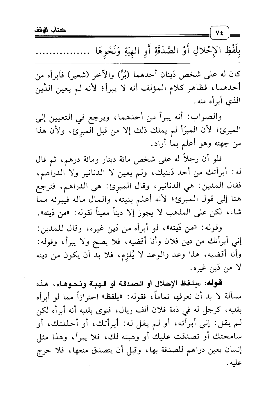 قوله: «بلفظ الإحلال أو الصدقة أو الهبة ونحوها»، هذه مسألة لا بد أن نعرفها تماماً، فقوله: «بلفظ» احترازاً مما لو أبرأه بقلبه، كرجل له في ذمة فلان ألف ريال، فنوى بقلبه أنه أبرأه لكن لم يقل: إني أبرأته، أو لم يقل له: أبرأتك، أو أحللتك، أو سامحتك أو تصدقت عليك أو وهبته لك، فلا يبرأ، وهذا مثل إنسان يعين دراهم للصدقة بها، وقبل أن يتصدق منعها، فلا حرج عليه.