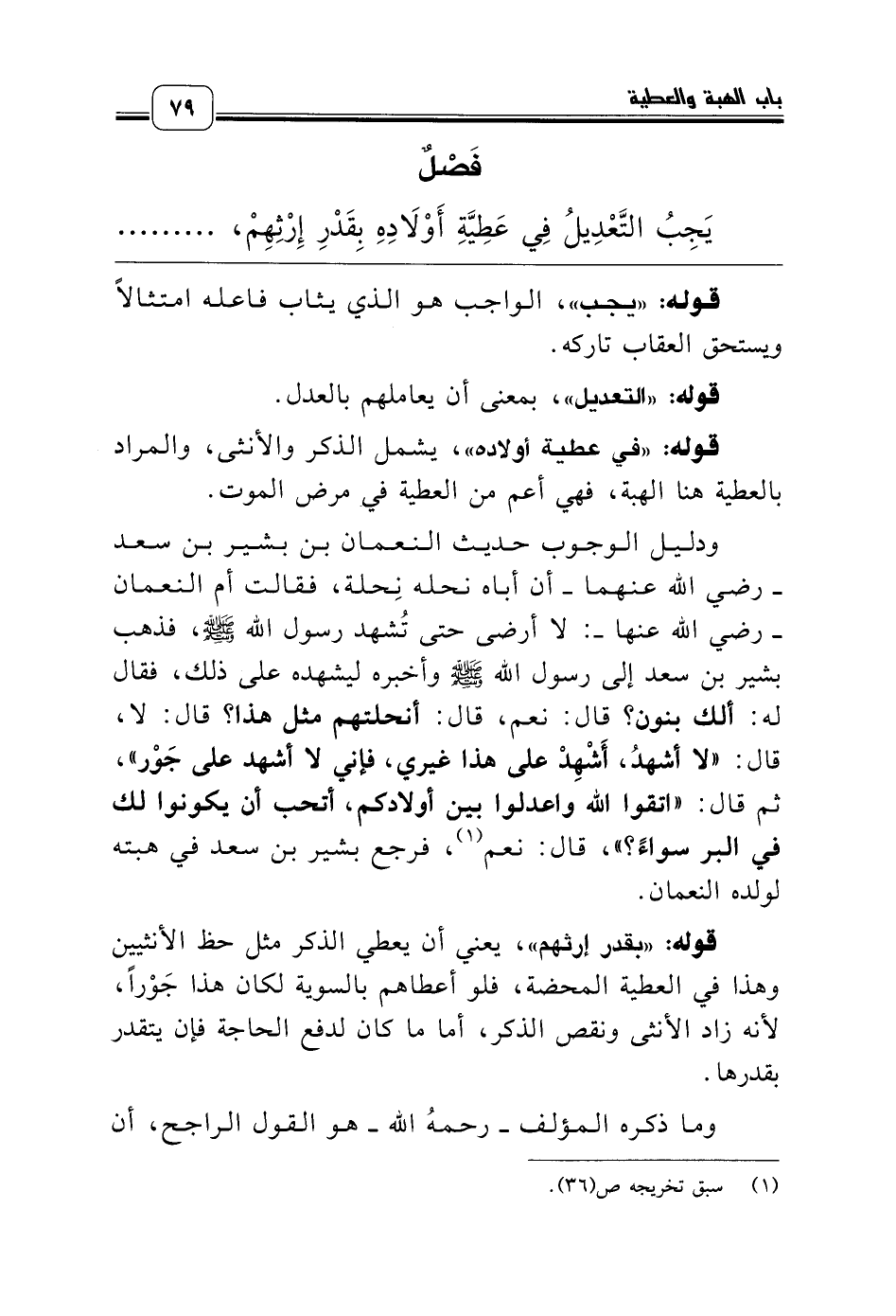 يَجِبُ التَّعْدِيلُ فِي عَطِيَّةِ أَوْلاَدِهِ بِقَدْرِ إِرْثِهِمْ، ......