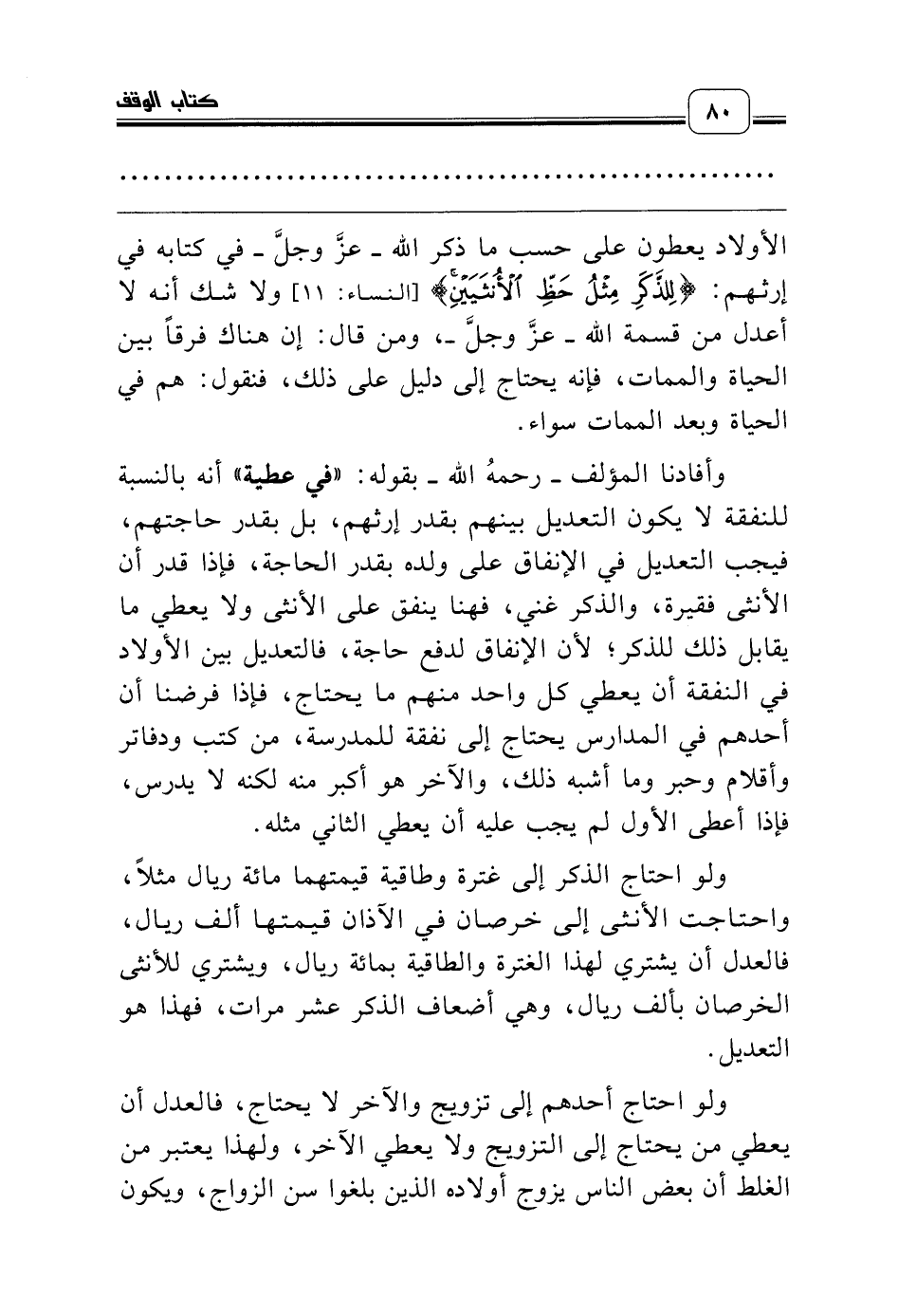 وأفادنا المؤلف ـ رحمه الله ـ بقوله: «في عطية» أنه بالنسبة للنفقة لا يكون التعديل بينهم بقدر إرثهم، بل بقدر حاجتهم، فيجب التعديل في الإنفاق على ولده بقدر الحاجة، فإذا قدر أن الأنثى فقيرة، والذكر غني، فهنا ينفق على الأنثى ولا يعطي ما يقابل ذلك للذكر؛ لأن الإنفاق لدفع حاجة، فالتعديل بين الأولاد في النفقة أن يعطي كل واحد منهم ما يحتاج، فإذا فرضنا أن أحدهم في المدارس يحتاج إلى نفقة للمدرسة، من كتب ودفاتر وأقلام وحبر وما أشبه ذلك، والآخر هو أكبر منه لكنه لا يدرس، فإذا أعطى الأول لم يجب عليه أن يعطي الثاني مثله.