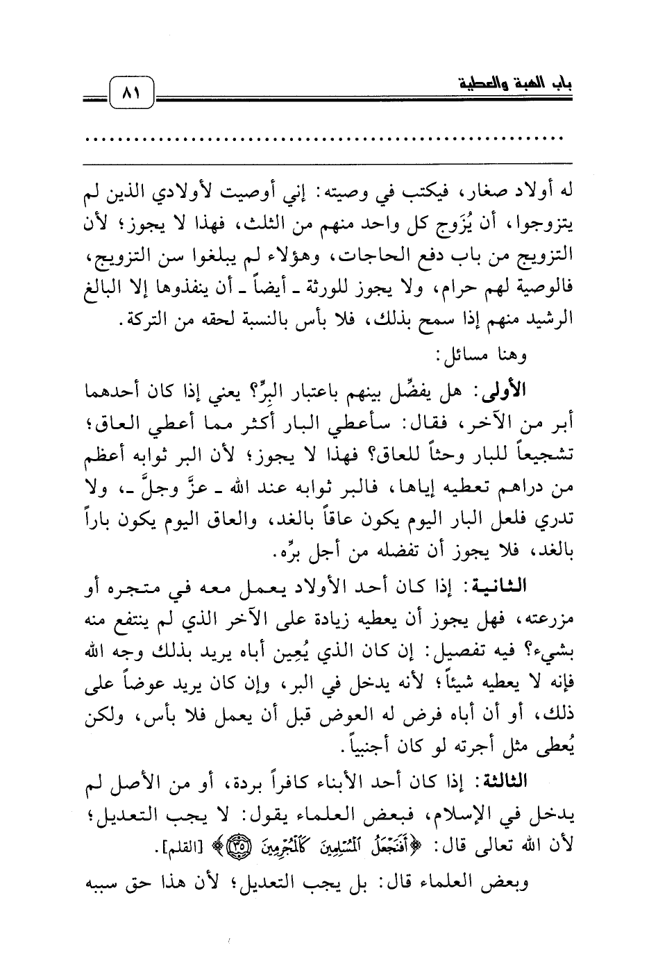 الأولى: هل يفضِّل بينهم باعتبار البِرِّ؟ يعني إذا كان أحدهما أبر من الآخر، فقال: سأعطي البار أكثر مما أعطي العاق؛ تشجيعاً للبار وحثاً للعاق؟ فهذا لا يجوز؛ لأن البر ثوابه أعظم من دراهم تعطيه إياها، فالبر ثوابه عند الله ـ عزّ وجل ـ، ولا تدري فلعل البار اليوم يكون عاقاً بالغد، والعاق اليوم يكون باراً بالغد، فلا يجوز أن تفضله من أجل برِّه.