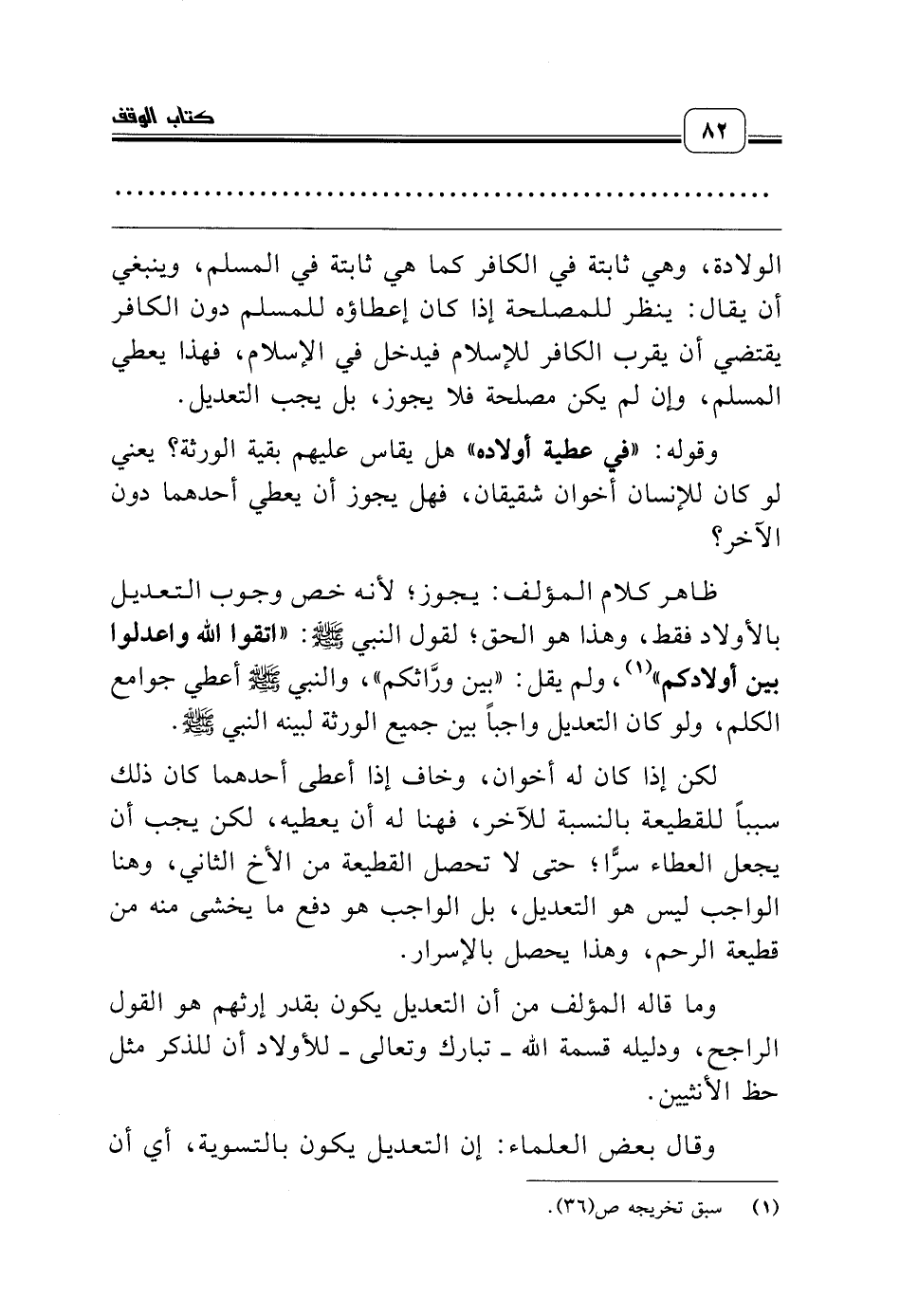 الولادة، وهي ثابتة في الكافر كما هي ثابتة في المسلم، وينبغي أن يقال: ينظر للمصلحة إذا كان إعطاؤه للمسلم دون الكافر يقتضي أن يقرب الكافر للإسلام فيدخل في الإسلام، فهذا يعطي المسلم، وإن لم يكن مصلحة فلا يجوز، بل يجب التعديل.