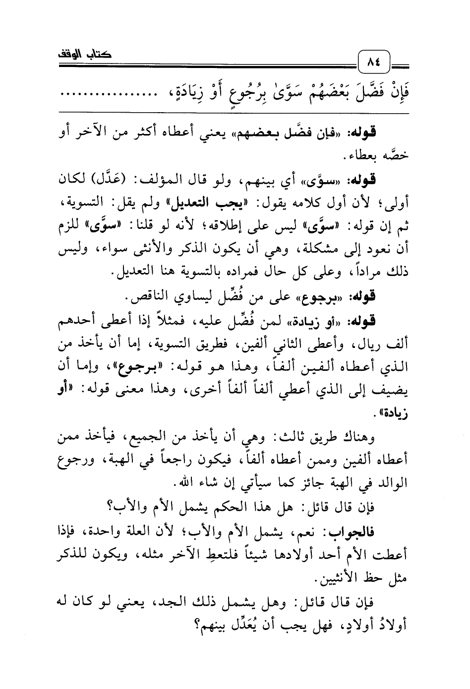 قوله: «أو زيادة» لمن فُضِّل عليه، فمثلاً إذا أعطى أحدهم ألف ريال، وأعطى الثاني ألفين، فطريق التسوية، إما أن يأخذ من الذي أعطاه ألفين ألفاً، وهذا هو قوله: «برجوع»، وإما أن يضيف إلى الذي أعطي ألفاً ألفاً أخرى، وهذا معنى قوله: «أو زيادة».