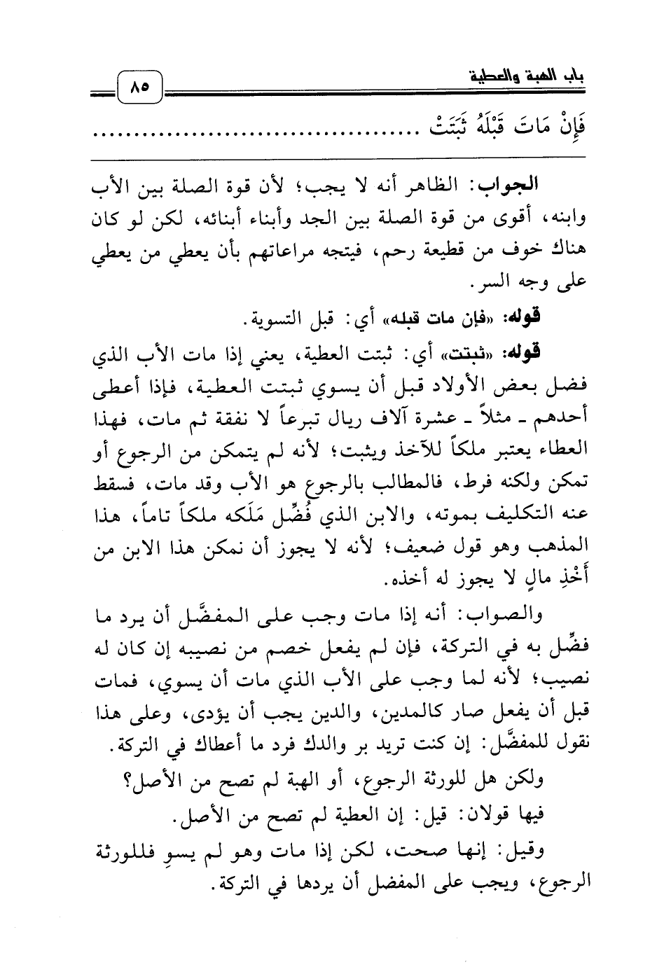 قوله: «ثبتت» أي: ثبتت العطية، يعني إذا مات الأب الذي فضل بعض الأولاد قبل أن يسوي ثبتت العطية، فإذا أعطى أحدهم ـ مثلاً ـ عشرة آلاف ريال تبرعاً لا نفقة ثم مات، فهذا العطاء يعتبر ملكاً للآخذ ويثبت؛ لأنه لم يتمكن من الرجوع أو تمكن ولكنه فرط، فالمطالب بالرجوع هو الأب وقد مات، فسقط عنه التكليف بموته، والابن الذي فُضِّل مَلَكه ملكاً تاماً، هذا المذهب وهو قول ضعيف؛ لأنه لا يجوز أن نمكن هذا الابن من أَخْذِ مالٍ لا يجوز له أخذه.