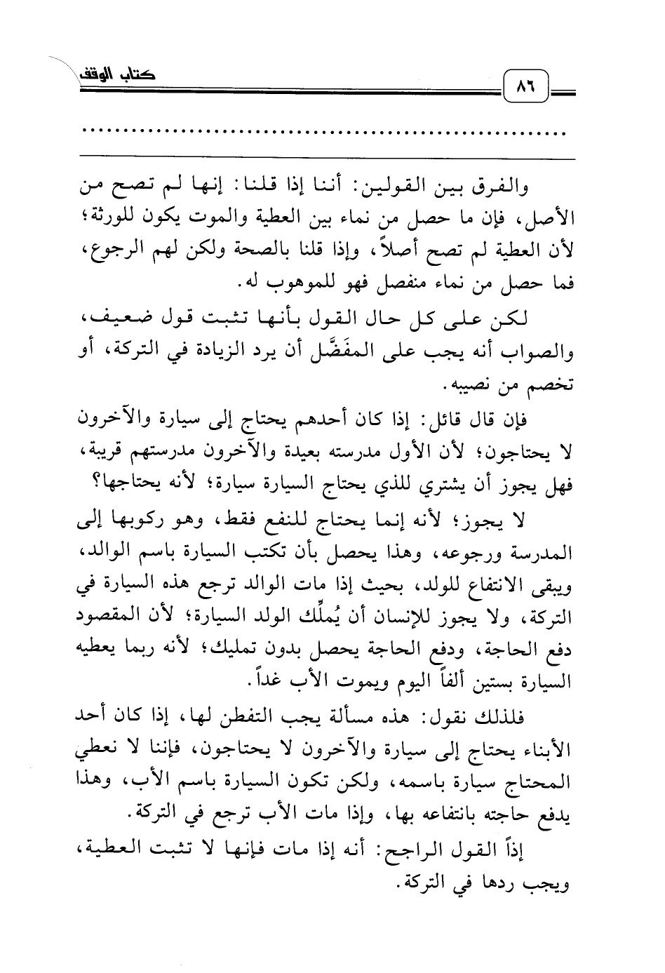 فلذلك نقول: هذه مسألة يجب التفطن لها، إذا كان أحد الأبناء يحتاج إلى سيارة والآخرون لا يحتاجون، فإننا لا نعطي المحتاج سيارة باسمه، ولكن تكون السيارة باسم الأب، وهذا يدفع حاجته بانتفاعه بها، وإذا مات الأب ترجع في التركة.